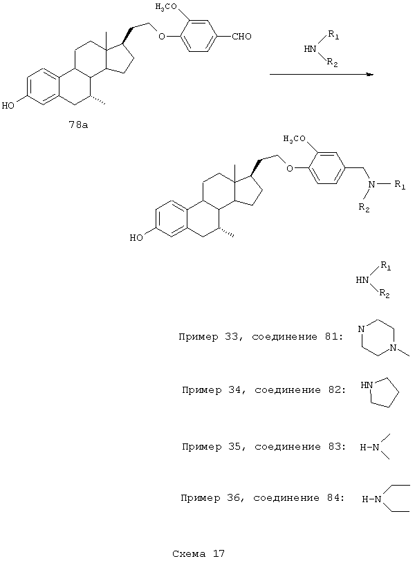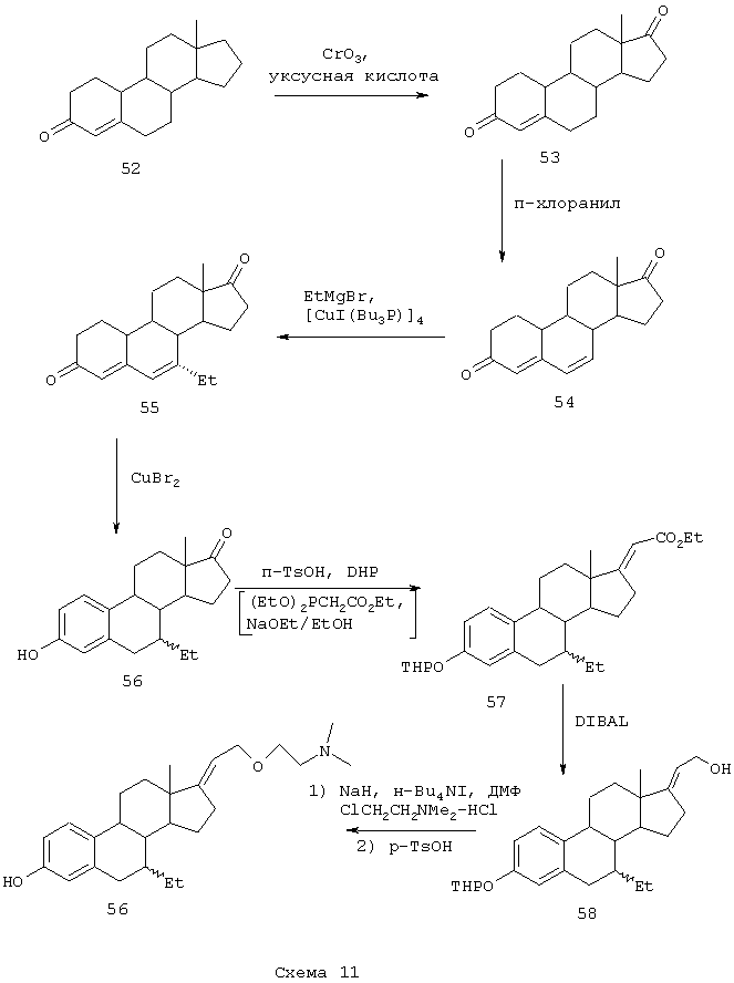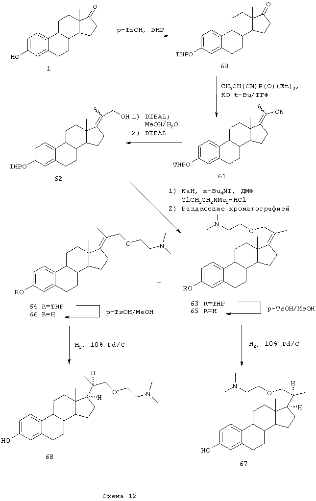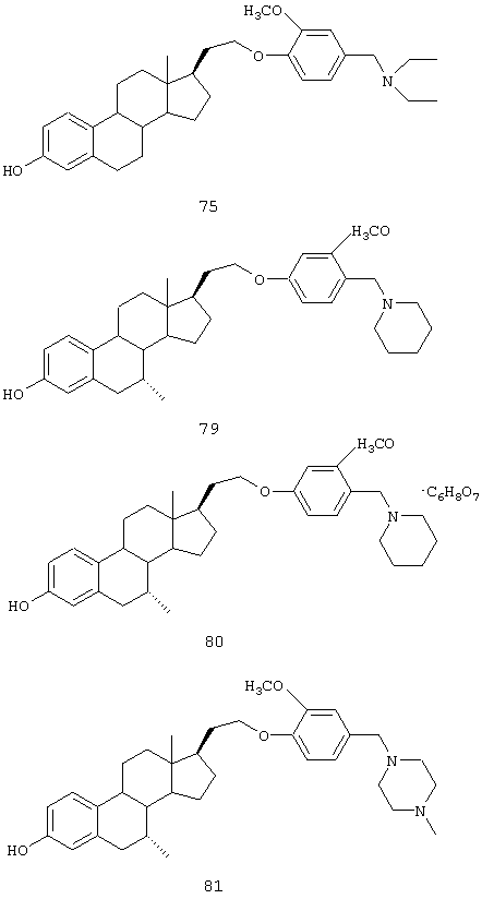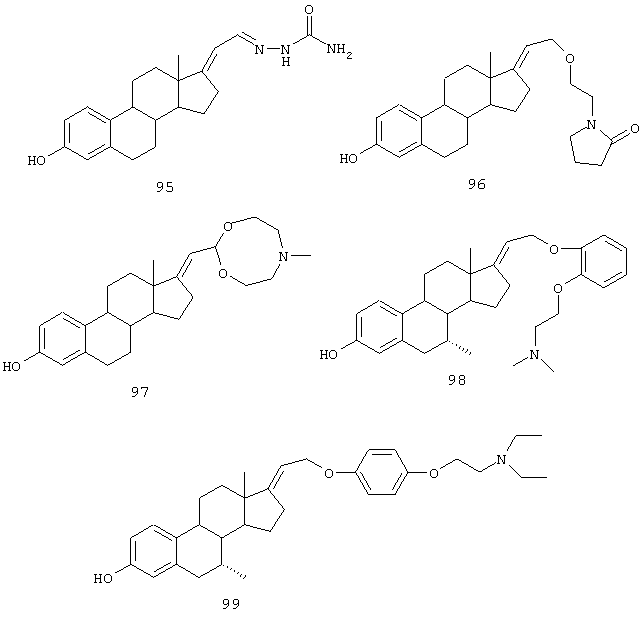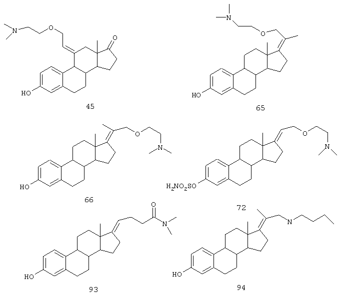 -диметиламиноэтокси-19-норпрегна-1,3,5(10)-триена; и Qian et al., J. Steroid Biochem. 29 (6):657-664 (1988), где оценивается корреляция между замещением в положении 17 эстрадиола и возможной антиэстрогенной активностью и описаны аналоги эстрадиола, замещенные в положении 17