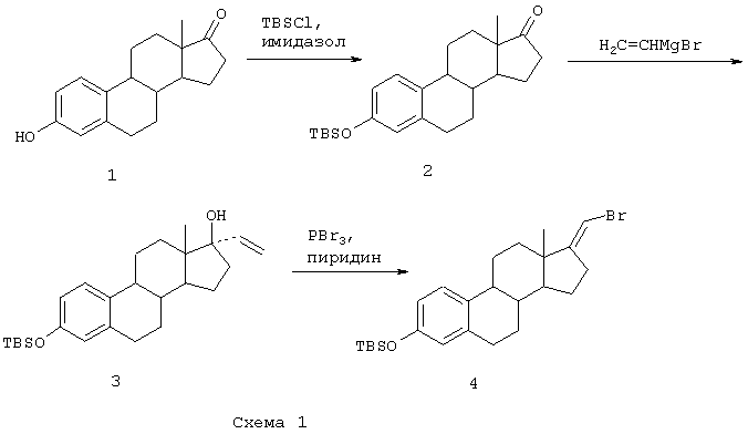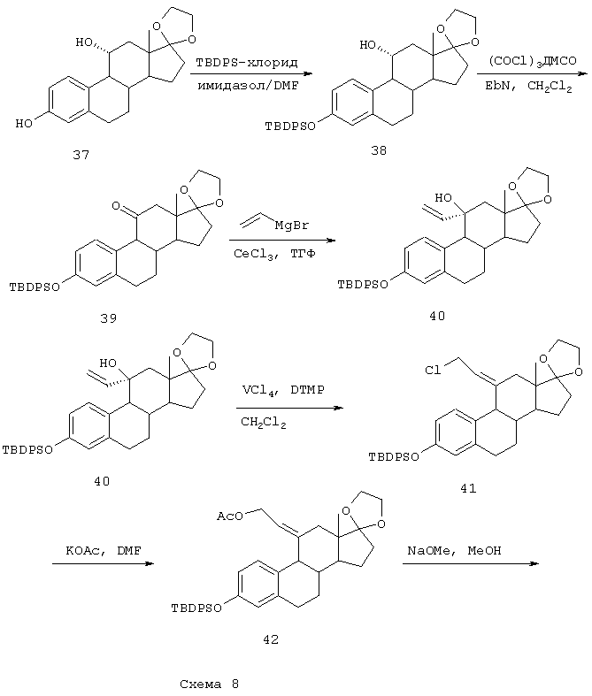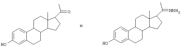 В нижеследующих примерах были сделаны попытки обеспечения точности в отношении используемых цифровых данных (например, количеств, температуры и т.д.), но некоторые экспериментальные ошибка и отклонение должны приниматься во внимание. Если нет других указаний, температура дается в °С и давление атмосферное или вблизи атмосферного. Все растворители куплены как имеющие ВЖХ-чистоту и все реакции проводили рутинным образом в инертной атмосфере аргона, если нет иных указаний. Все реагенты получали коммерческим путем, если нет других указаний. Эстрон и эстрадиол покупали из Berlichem U.S.; этинилэстрадиол покупали из Akzo Nobel. Анализы ЯМР проводили на Varian Gemini 300 и стандартом был хлороформ при