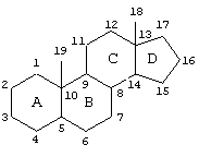 Кроме того, пяти- и шестичленные кольца стероидной молекулы часто обозначаются А, В, С и D, как показано.