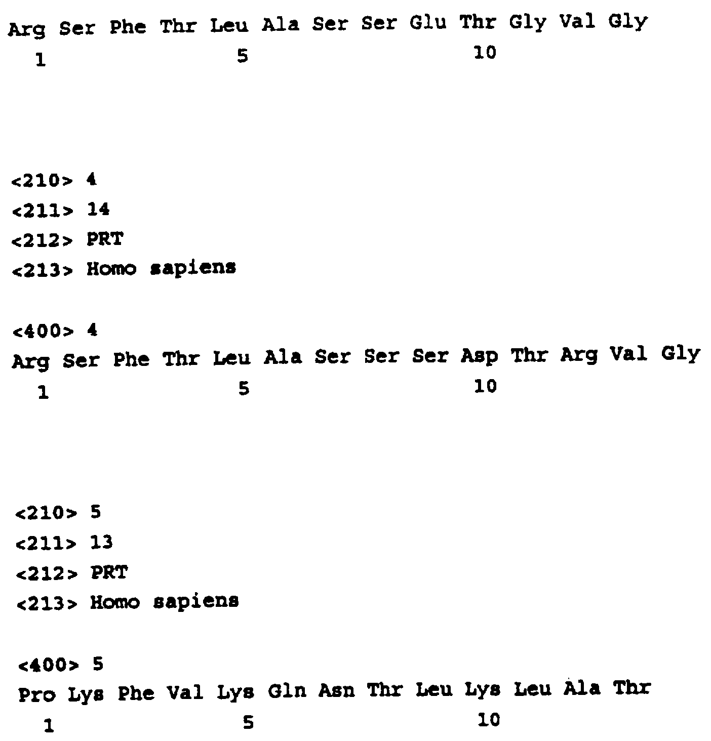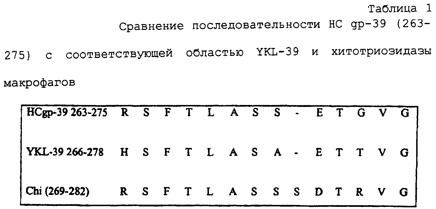 Белок YKL-39 хондроцитов человека проявляет значительную идентичность последовательности с НС gp-39 (YKL-40). Другой гомолог НС gp-39 секретируется макрофагами человека и называется хитотриозидазой (Boot et al., 1995). Последовательности, соответствующие RSFTLASSETGVG (НС gp-39 (263-275), SEQ ID NO:3), были идентифицированы в виде HSFTLASAETTVG в белке YKL-39 (266-278) и в виде RSFTLASSSDTRVG (SEQ ID NO:4) в хитотриозидазе макрофагов (269-282) соответственно (таблица 1). Chi (269-282) содержит мотив связывания пептида HLA-DRB1*0401, который ранее использовали для селекции эпитопов Т-клеток в белках. Напротив, пептид YKL-39 (266-278) не содержит этого мотива. Все пептиды были синтезированы.