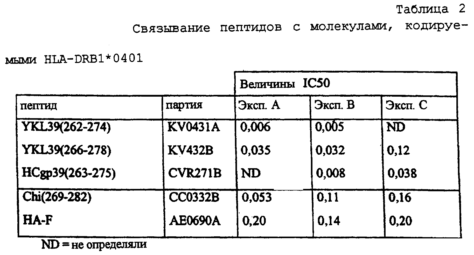 Пептиды из примера 1 тестировали на связывание молекул, кодируемых DRB1*0401. Молекулы HLA-DR4 (DRB1*0401) очищали из гомозиготных трансформированных EBV В-лимфобластоидных линий клеток человека Huly138IC2 и проводили конкурентный анализ связывания пептида HLA-DR, в основном как описано Verheijden et al., 1997. Сродство данного пептида в отношении связывания кодируемых DRB1*0401 молекул соотносили с конкуренцией маркерного пептида. Это относительное сродство связывания определяли как концентрацию пептида, при которой сигнал снижался на 50% (IC50). Пептид HA-F является положительным контролем (гемагглютинин 307-319; PKFVKQNTLKLAT; в положении 309 Y заменен на F; SEQ ID NO:5). Известно, что пептид обладает высоким сродством к молекулам DRB1*0401.