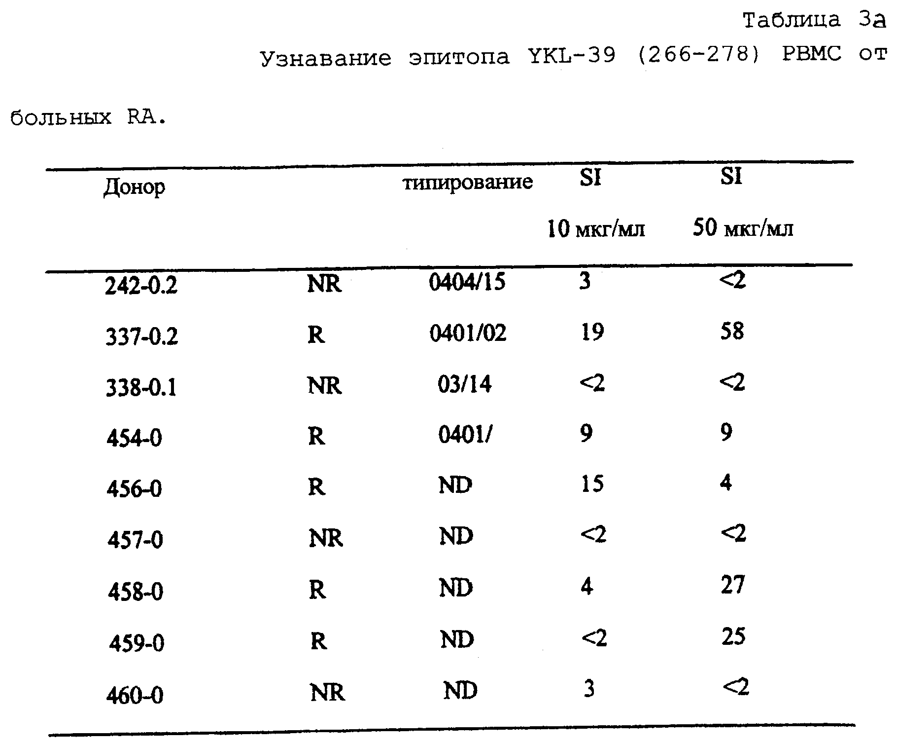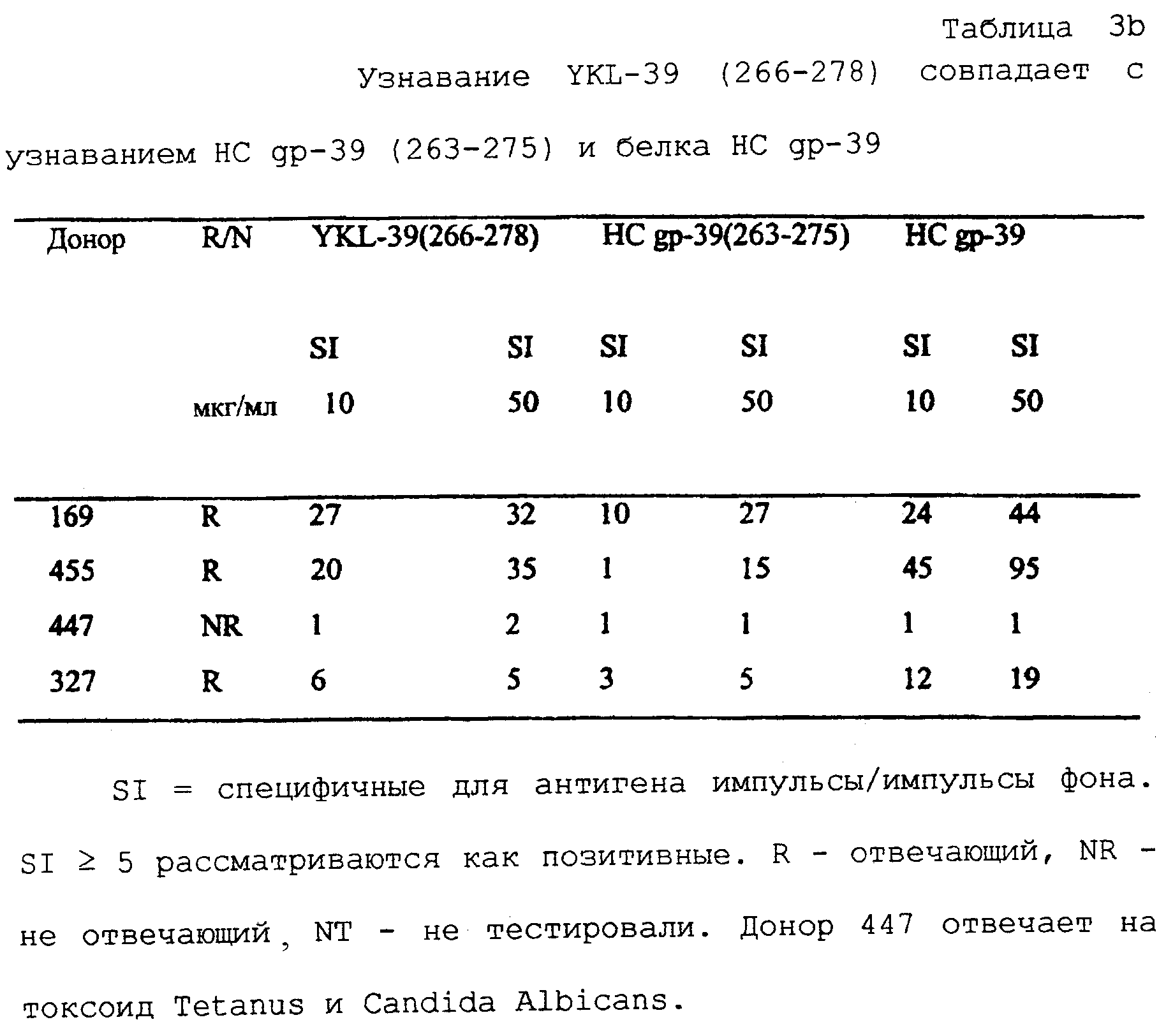 Мононуклеарные клетки периферической крови (РВМС) выделяли из гепаринизированной периферической крови с помощью стандартного центрифугирования в Ficoll-Paque (Pharmacia, Uppsala, Sweden). Клетки суспендировали в лунках 24-луночного планшета при концентрации 5 105 клеток на 1 мл. Клетки инкубировали в среде в отсутствие или в присутствии 10 или 50 мкг/мл пептидного антигена (YKL-39 (266-278)). Культуры инкубировали в течение 6 дней при 37°С во влажной атмосфере 5% CO2. Клетки затем суспендировали, и среду объемом 100 или 150 мкл вносили в 4 параллелях в лунки 96-луночного планшета с лунками с круглым дном. Клетки затем подвергали импульсному действию 0,5 мкКи (1,85 104 Бк (имп./сек)) [3Н]тимидина ([3H]TdR), и через 18 час измеряли включенную радиоактивность. Представленные в таблицах 3а и 3б результаты выражены в виде индексов стимуляции (SI) (специфичные для антигена импульсы/импульсы фона).