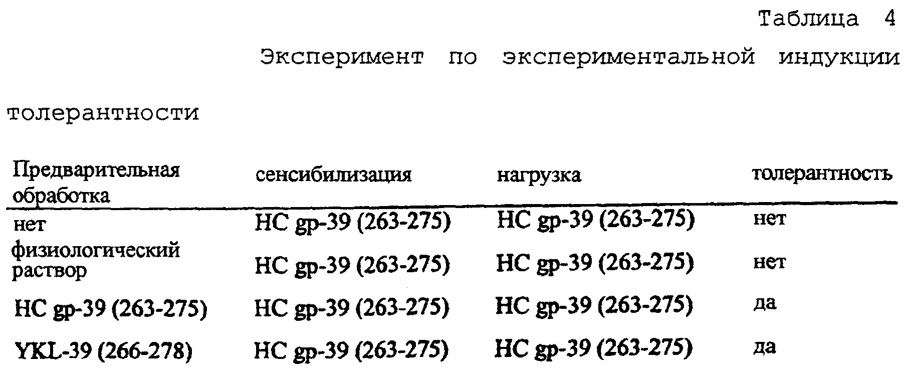 Был разработан специфичный в отношении НС gp-39′(263-275) способ анализа DTH, пригодный для мониторинга индукции толерантности с помощью пептидных антигенов. Было обнаружено, что иммунизация мышей Balb/c НС gp-39(263-275) в неполном адъюванте Фрейнда (IFA) эффективна в плане индукции ответа DTH с последующей нагрузкой пептидом НС gp-39(263-275). Эта основанная на пептиде система DTH была применена для выявления модуляции ответа DTH с помощью интраназальной аппликации пептида НС gp-39(263-275). Было обнаружено, что интраназальная аппликация НС gp-39 (263-275) дозо-зависимым образом негативно модулирует индуцированный НС gp-39 (263-275) ответ DTH. Интраназальная аппликация YKL-39 (266-278), однако, приводила к более сильной негативной модуляции ответа DTH, что указывает на то, что YKL-39 (266-278) может эффективно вызывать толерантность специфического в отношении пептида ответа, индуцированного НС gp-39 (263-275) (таблица 4, фиг.4, 5, 6).
