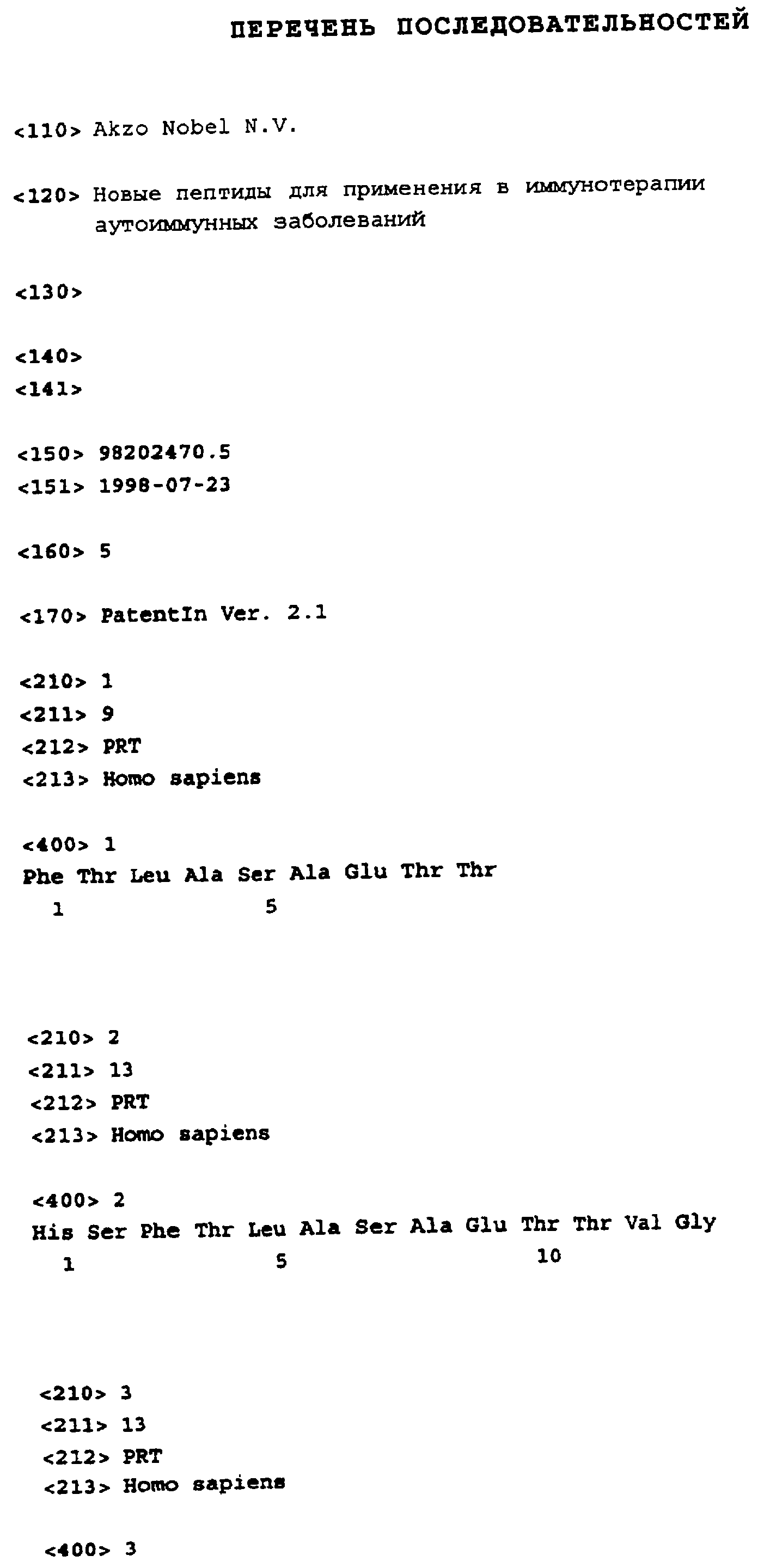 Таким образом, согласно изобретению по пептидам указанные пептиды, напоминающие рестриктированные эпитопы Т-клеток МНС класса II, присутствуют на аутоантигене-мишени, включающем в себя пептид SEQ ID NO:l или SEQ ID NO:2, являются весьма подходящими для применения в терапии для индукции специфической толерантности Т-клеток к указанному аутоантигену у млекопитающих, более конкретно у людей, страдающих от опосредуемого Т-клетками разрушения хряща, такого, например, как артрит, более конкретно – ревматоидный артрит. Необязательно такое лечение может сочетаться с введением других лекарств, таких как DMARDs (модифицирующие болезнь антиревматоидные лекарства), например сульфасалазин, противомалярийные препараты (хлорохин, гидроксихлорохин), вводимое или применяемое перорально золото, метотрексат, D-пеницилламин, азатиоприн, циклоспорин, микофенолат), NSAIDs (нестероидные противовоспалительные лекарства), кортикостероиды или другие лекарства, которые, как известно, влияют на течение болезни у больных аутоиммунным заболеванием.
