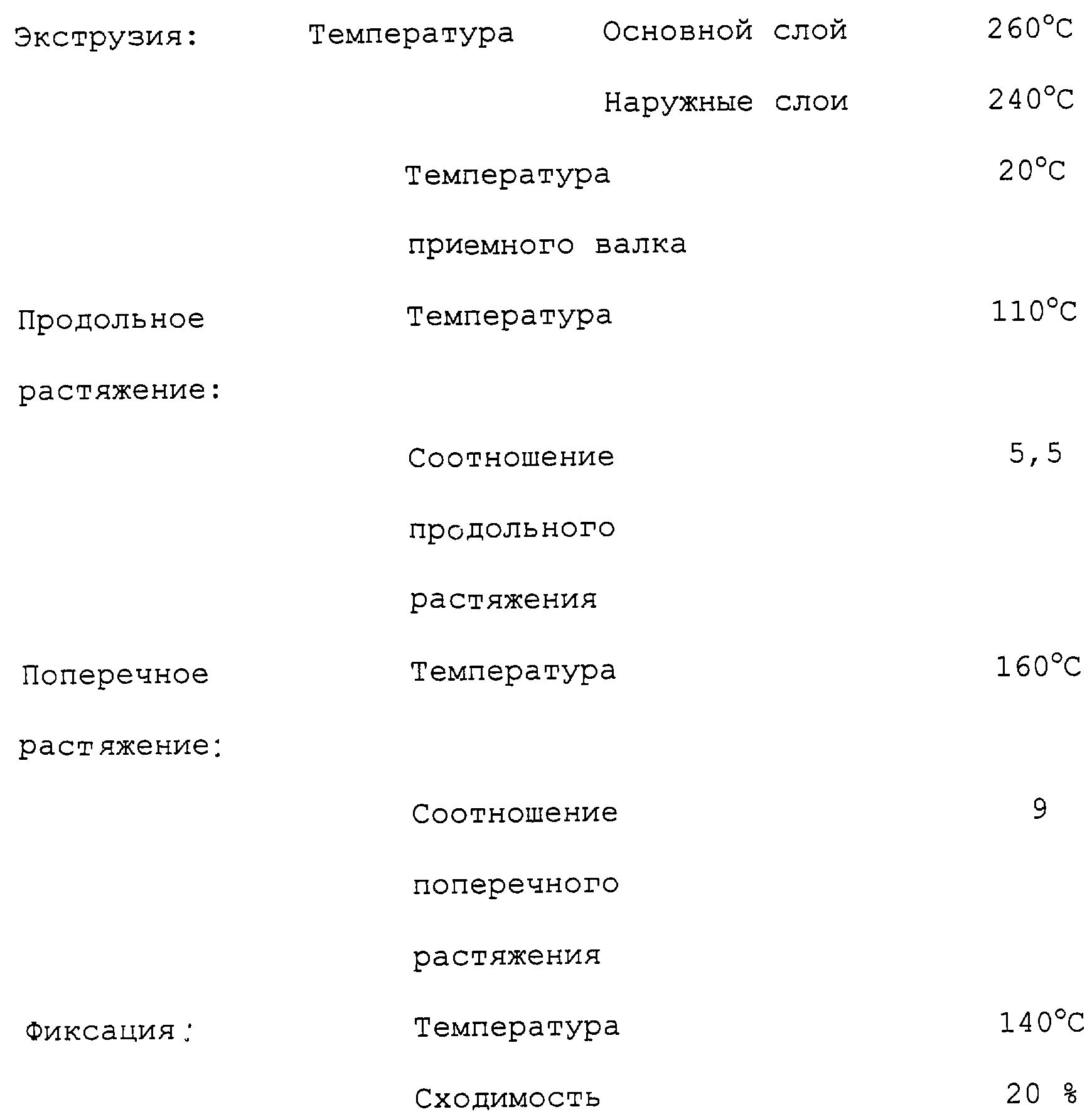 Затем полученную таким образом пленку растягивают в продольном и поперечном направлениях по отношению к направлению экструзии, что приводит к ориентации молекулярных цепей. Продольное растяжение целесообразно проводить с помощью двух – в зависимости от требуемого соотношения растягивания – разных быстродействующих валков, поперечное растяжение производится с помощью соответствующей шпан-рамы. Соотношения продольного растяжения лежат в диапазоне от 4 до 8, предпочтительно от 5 до 6. Соотношения поперечного растяжения лежат в диапазоне от 5 до 10, предпочтительно от 7 до 9.