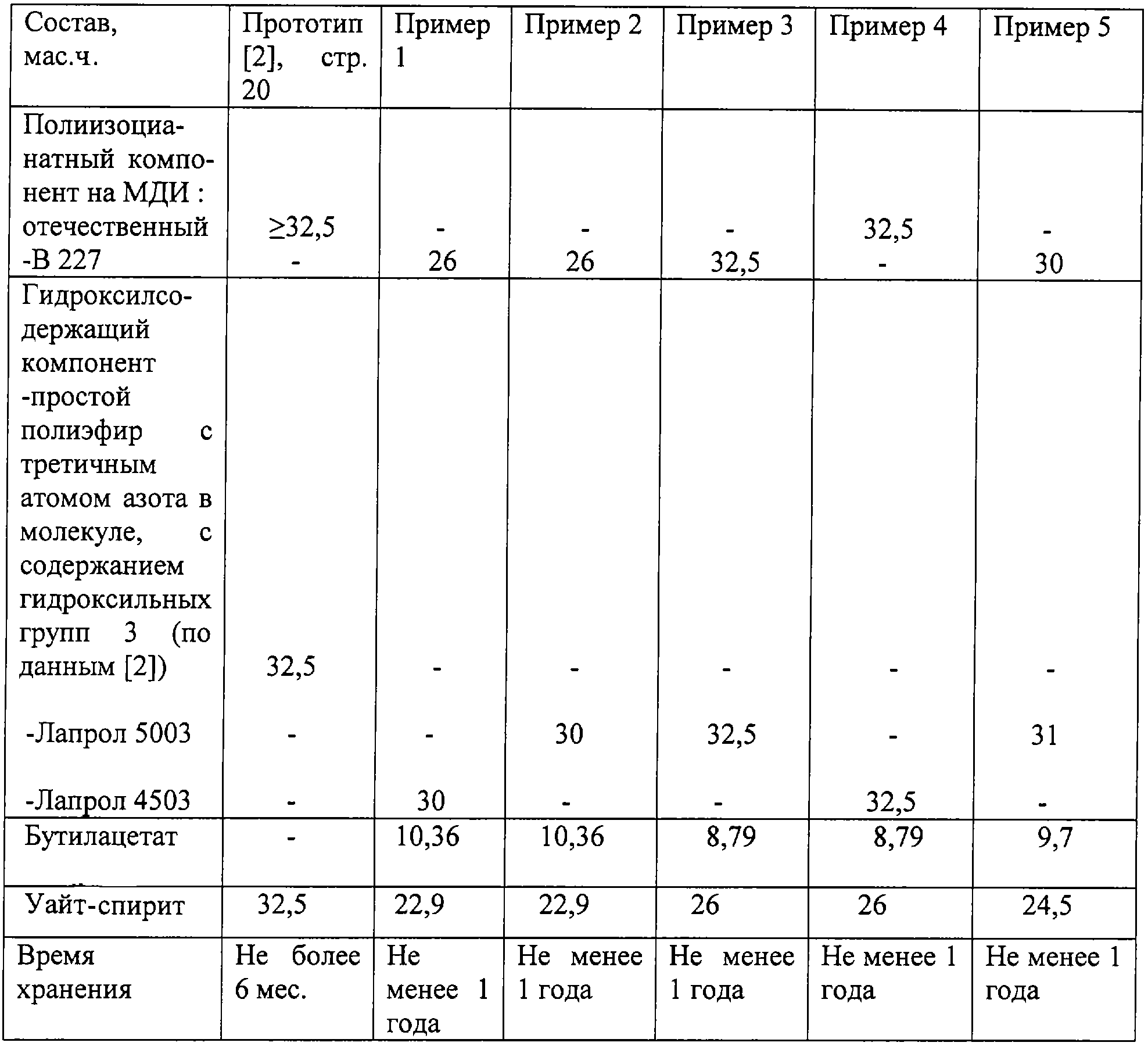 (57) Реферат: Изобретение относится к способам получения полиуретановых форполимеров, которые предназначены для получения покрытий для защиты металлических, бетонных, деревянных, стеклянных поверхностей от воздействия различных атмосферных и агрессивных сред, коррозии, статического электричества, абразивного износа и могут быть использованы в качестве защитного внутреннего и наружного покрытия трубопроводов, емкостей и цистерн, инженерных и гидротехнических сооружений, энергетических установок, портовых сооружений, кровельного железа и черепицы, а также в качестве декоративного покрытия. Способ осуществляют, смешивая гидроксилсодержащий компонент с гидроксильным числом 32-37 мг КОН/г Лапрол 5003 или Лапрол 4503 с уайт-спиритом, затем с бутилацетатом либо со смесью бутилацетата с уайт-спиритом и в полученную смесь добавляют полиизоцианат на основе 4,4’-дифенилметандиизоцианата с содержанием NCO-групп не менее 29,5 г/100 г и синтез проводят при перемешивании до содержания массовой доли изоцианатных NCO-групп в форполимере 7,5-11,5%. Технический результат изобретения – получение форполимера со стабильными характеристиками (не менее года). 1 табл. Изобретение относится к способам получения защитных полиуретановых покрытий на основе форполимеров, которые предназначены для защиты металлических, бетонных, деревянных, стеклянных поверхностей от воздействия различных атмосферных и агрессивных сред, коррозии, статического электричества, абразивного износа и могут быть использованы в качестве защитного внутреннего и наружного покрытия трубопроводов, емкостей и цисцерн, инженерных и гидротехнических сооружений, энергетических установок, портовых сооружений, кровельного железа и черепицы, а также в качестве декоративного покрытия. Известны способы получения однокомпонентных полиуретановых лакокрасочных покрытий, отверждаемых влагой воздуха, (О.В. Орлова, Т.Н. Фомичева. Технология лаков и красок. Москва: Химия, 1990 г., стр.139 [1]) путем смешения исходных компонентов. Конечным пленкообразующим веществом-покрытием является изоцианатсодержащий преполимер (форполимер), полученный при взаимодействии гидроксилсодержащего соединения – полиола с избытком изоцианата. Форполимеры содержат не менее трех свободных изоцианатных групп, обеспечивающих сшивание в процессе пленкообразования. Отверждение и сшивка указанных полимеров происходят непосредственно на подложке за счет взаимодействия изоцианатных групп с влагой воздуха и образования аминогрупп – поперечных мочевинных связей. Реакция взаимодействия изоцианатных групп форполимера с влагой воздуха с образованием аминогрупп описана в [1], стр.140. При взаимодействии аминогрупп с изоцианатными группами форполимера образуется полимер сетчатой структуры, т.е. происходит отверждение покрытия. Известны покрытия (А.М. Тартаковская, А.А. Благонравова, Однокомпонентные полиуретановые лакокрасочные материалы, отверждаемые влагой воздуха (обзор литературы). Лакокрасочные материалы, 1976, №2, стр.19-21 [2], И.Н. Бакирова, В.И. Мулюкова, И.Г. Демченко, Л.А. Зенитова, Н.А. Розенталь. Лаки на основе отходов полиуретановых производств. Материалы и полупродукты, стр.3-4 [3]), в способах получения которых путем смешения исходных компонентов полиизоцианатсодержащего компонента и гидроксилсодержащего компонен