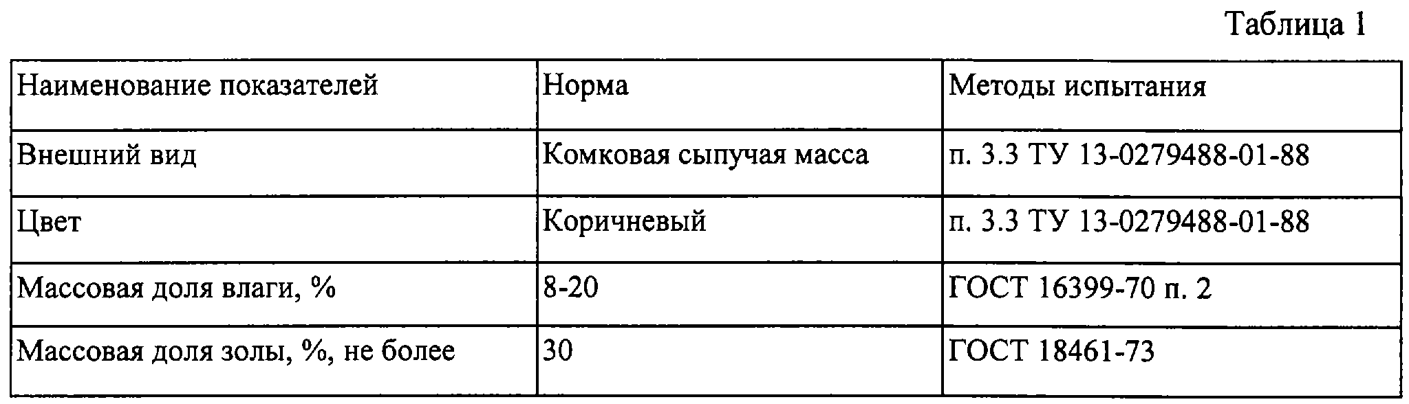 Шлам-лигнин является побочным продуктом целлюлозно-бумажного производства. Он образуется в тоннажных количествах в результате очистки сточных вод на Байкальском целлюлозно-бумажном комбинате. В соответствии с ТУ 13-0279488-01-88 шлам-лигнин должен удовлетворять следующим нормам (см. табл. 1).