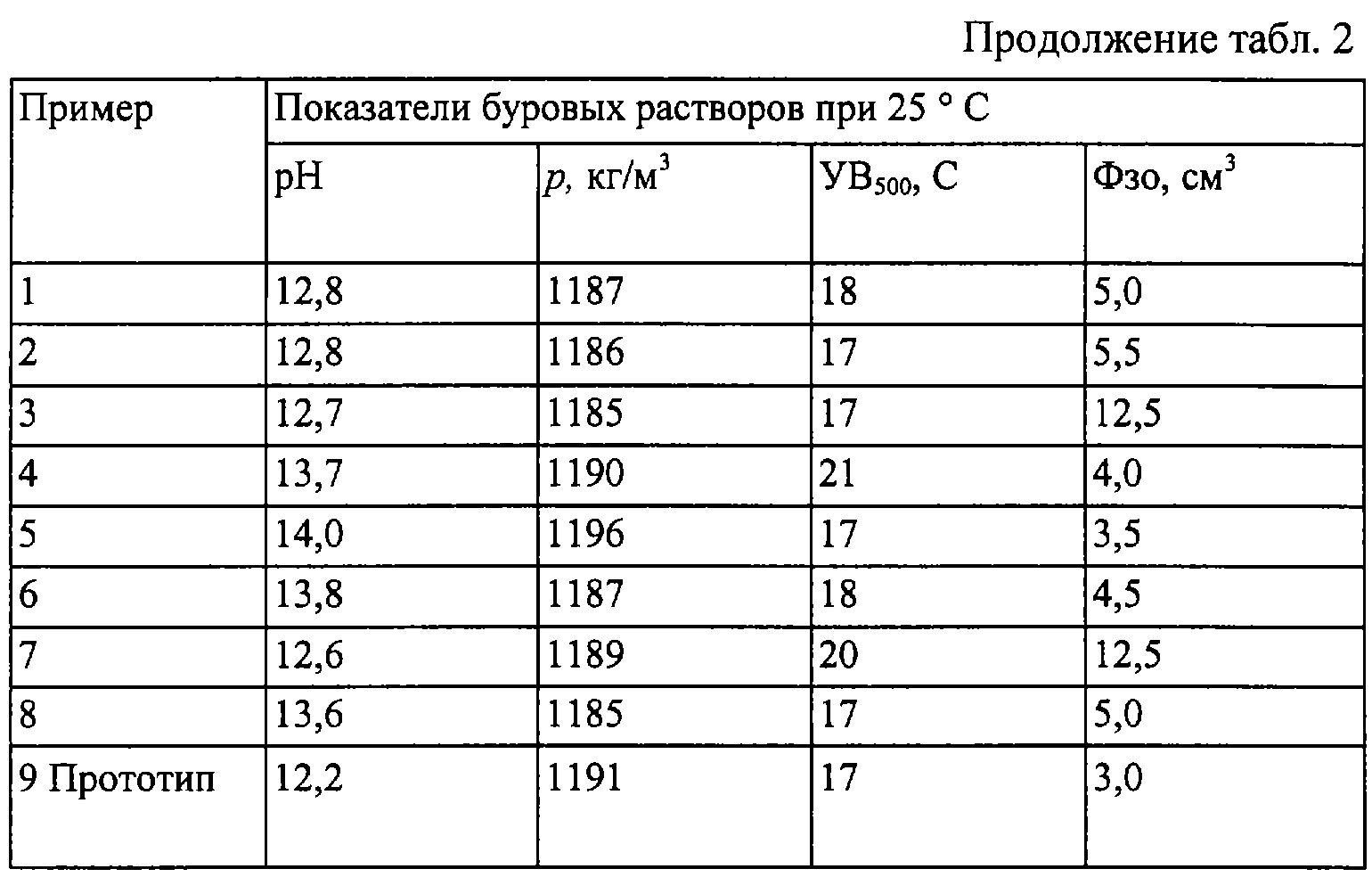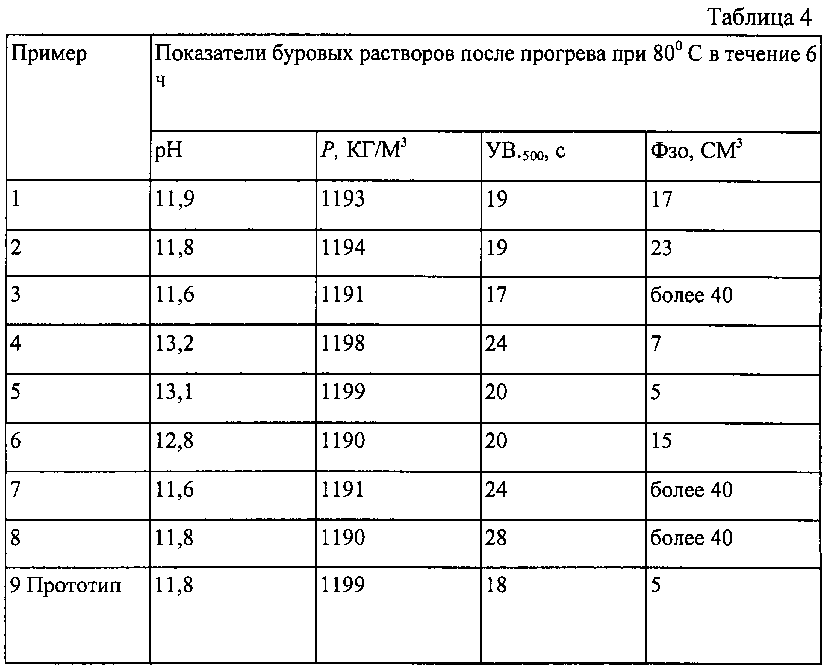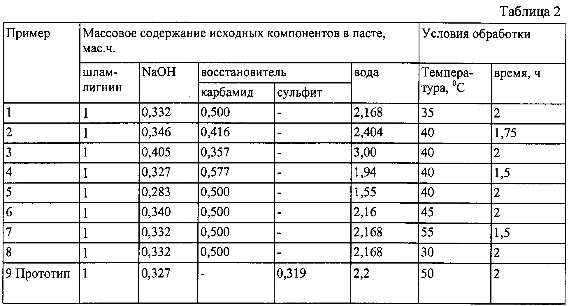 Аналогичным образом были приготовлены и испытаны все остальные растворы, в том числе и раствор-прототип. Результаты приведены в табл. 2-4. Сопоставление свойств буровых растворов, полученных из шлам-лигнинового реагента согласно предлагаемому техническому решению, позволило определить оптимальное соотношение ингредиентов шлам-лигнин:NаОН:карбамид = 1:(0,28-0,35):(0,38-0,625). Превышение содержания щелочи и карбамида нецелесообразно из соображений экономии, а снижение содержания карбамида ниже 0,38 не позволяет достичь поставленной цели (пример 3). Проведение обработки при температурах ниже 35 С и выше 45 С не дает желаемого эффекта (примеры 7, 8).