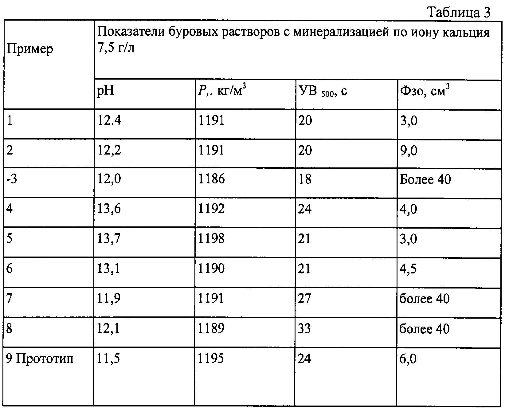 К буровому раствору, полученному по примеру 1, добавляют прокаленный хлористый кальций до массовой концентрации катионов кальция в буровом растворе 7,5 г/л. Перемешивают в течение 2 ч. Повторно определяют технологические показатели бурового раствора (табл. 3).