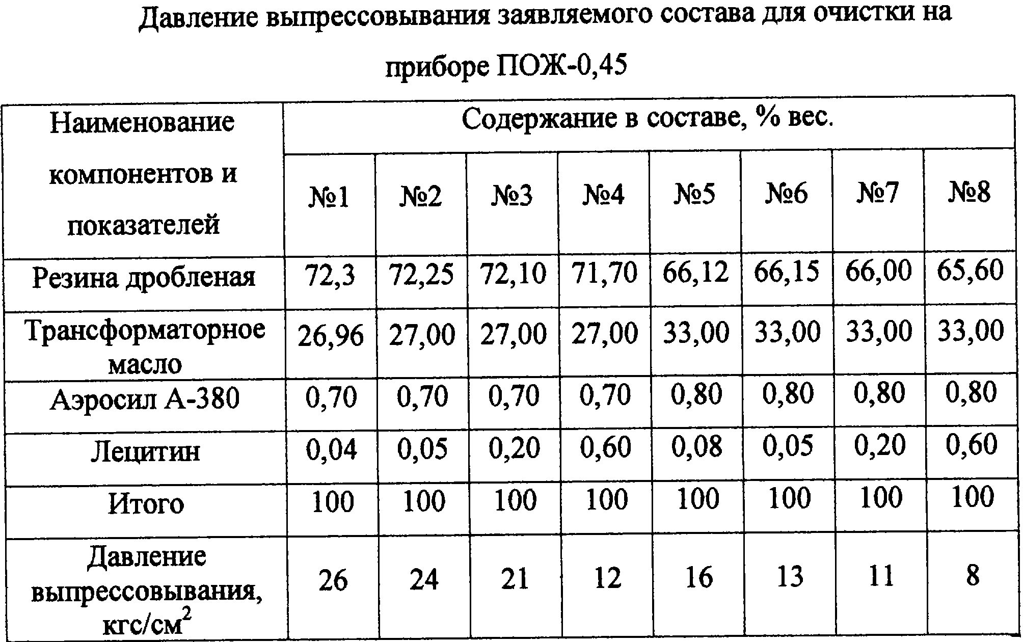 Содержание компонентов состава для очистки в предлагаемых авторами пределах обеспечивает высокую очищающую способность и безопасность процесса очистки оборудования. При содержании трансформаторного масла и лецитина менее 27 и 0,05% соответственно, повышается давление выпрессовывания и процесс чистки становится опасным. Увеличение содержания трансформаторного масла в составе выше 33% приводит к снижению очищающей способности. Содержание аэросила А-380 менее 0,7% приводит к агрегированию резины дробленой в процессе хранения, тем самым ухудшая очищающие свойства состава и повышая давление выпрессовывания. Увеличение содержания аэросила более 0,8% не оказывает существенного влияния на свойства очищающего состава.