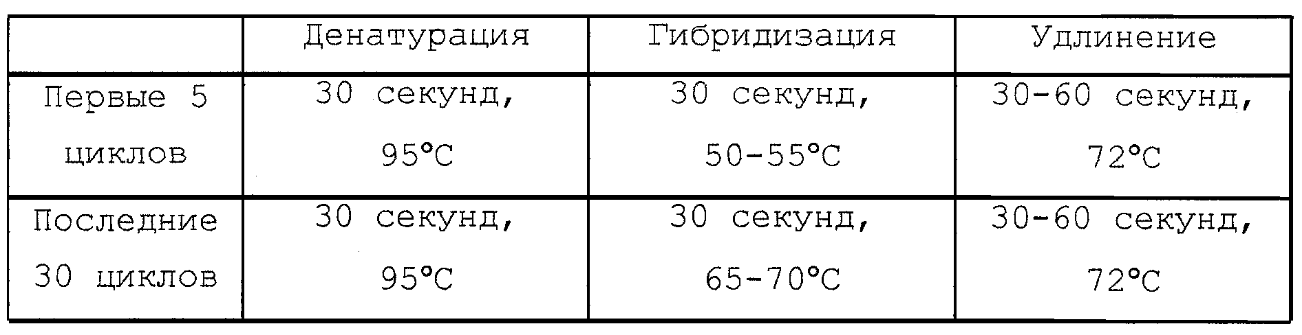 Ниже представлен протокол проведения стандартной ПЦР: в качестве матрицы использовали 50-200 нг геномной ДНК в присутствии 20-40 мкМ каждого олигонуклеотида, 400-800 мкМ раствора dNTP, 1 х ПЦР-буфера (включая 1,5 мМ MgCl2), 2,5 единиц ДНК-полимеразы TaqI (с использованием Perkin-Elmer AmpliTaQ, GIBCO Platinum, ДНК-полимеразы Pwo или полимеразы Taq Tahara Shuzo).
