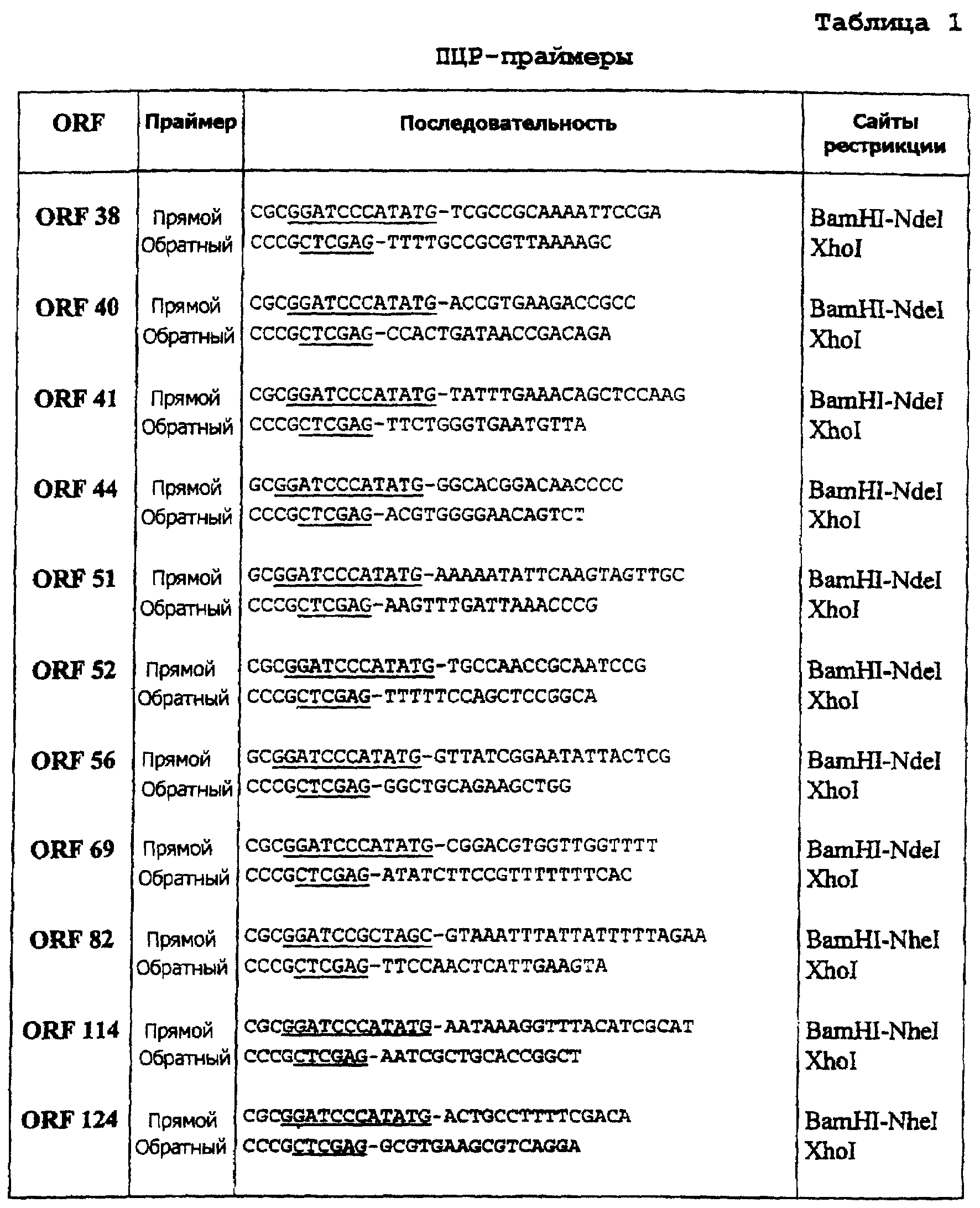 5’-Праймеры включают два рестрикционных сайта распознавания ферментом (BamHI-NdeI, BamHI-NheI или EcoRI-NheI, в зависимости от рестрикционной карты самого гена); 3’-праймеры включают рестрикционный XhoI-сайт. Эта процедура разработана для прямого клонирования каждого продукта амплификации (соответствующего каждой ORF) в две различные экспрессирующие системы: pGEX-KG (с использованием либо BamHI-XhoI, либо EcoRI-XhoI) и pET21b+ (с использованием либо NdeI-XhoI, либо NheI-XhoI).