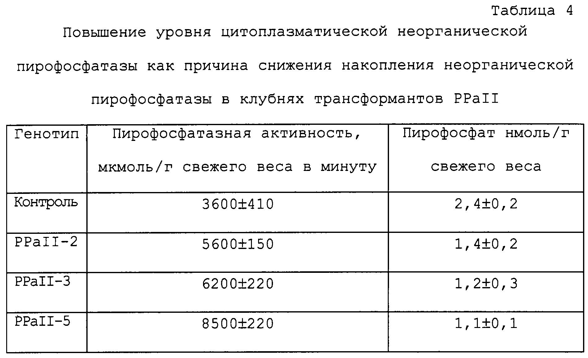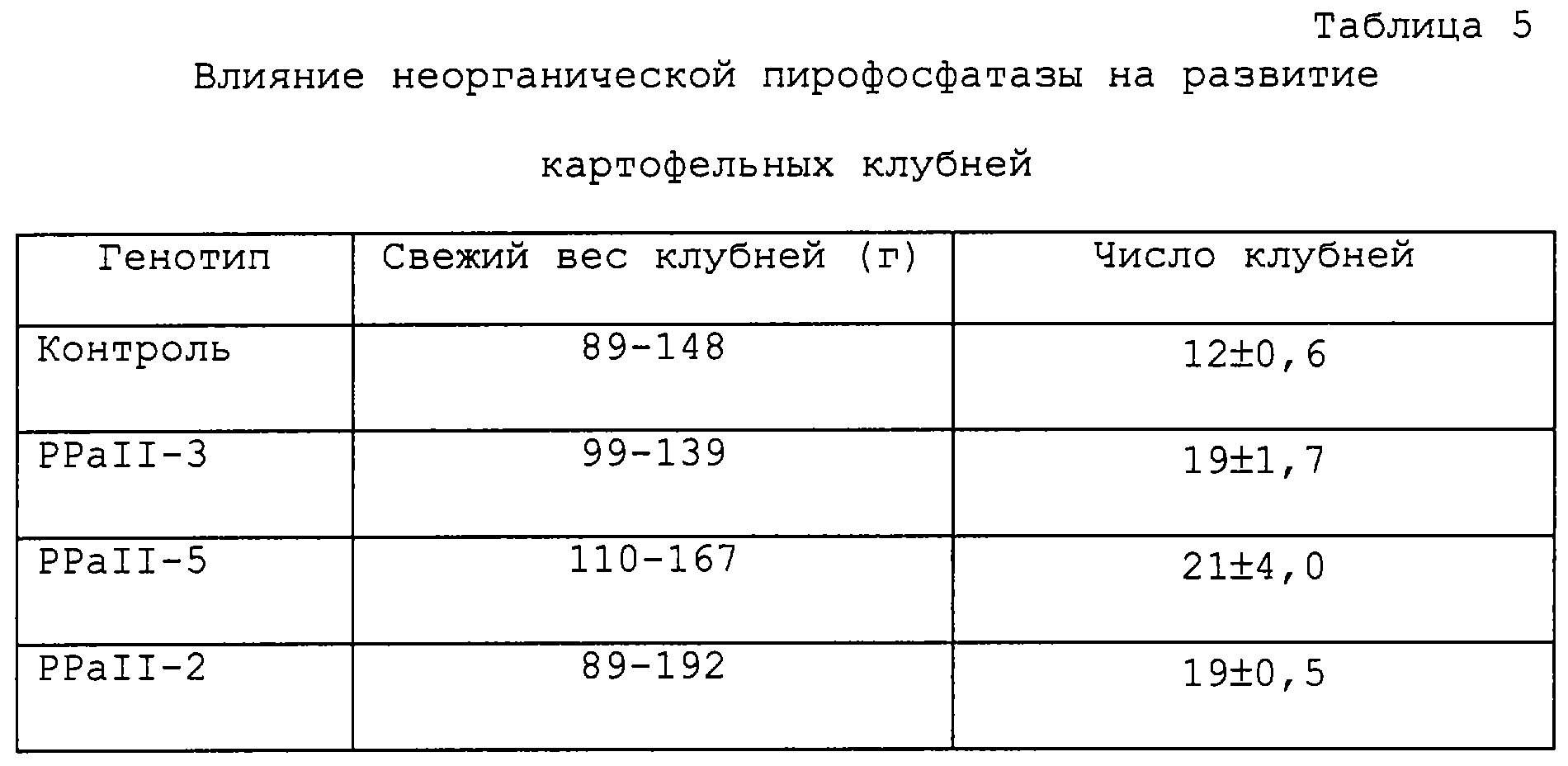 Фиг.4 показывает данные Вестерн-блоттинга белкового экстракта, полученного из клубней картофеля контрольных растений и вариантов PPaII-2, PPaII-3, PPaII-5, PPaI-2 и PPaI-55 с использованием антител к неорганической пирофосфатазе. Полосы 1 и 2 соответствуют образцам, полученным от двух независимых клубней.