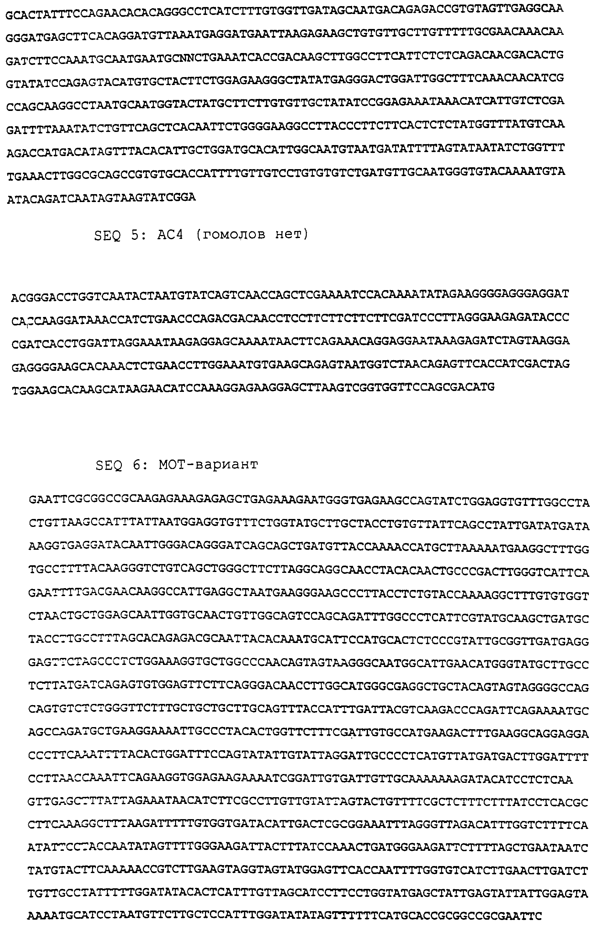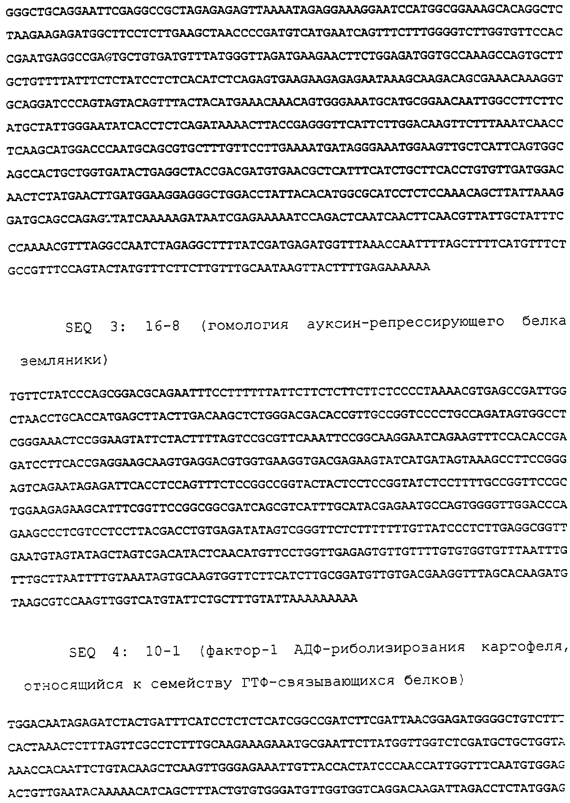Также заявители идентифицировали пять конкретно предпочтительных последовательностей ДНК, которые, как считается, также могут быть применены в способе по настоящему изобретению. Авторы выявили эти последовательности ДНК, как индуцируемые в ходе хранения клубней, и обозначили их как 16-3 (последовательность 2), 16-8 (последовательность 3), 10-1 (последовательность 4) и АС4 (последовательность 5), М-1-1 (МОТ) (последовательность на фиг.19) и МОТ-вариант (последовательность 6 – она имеет депозитарный № Х99853 в базе данных EMBL). Последовательности ДНК и их выделение полностью описаны в соответствующих примерах. Тем самым настоящее изобретение представляет, в соответствии со следующим своим аспектом, использование всех или части последовательностей ДНК клонов 16-3, 10-1, ВС4, 16-8, М-1-1 и МОТ-варианта в способе по настоящему изобретению с целью предотвращения образования побегов у растений.