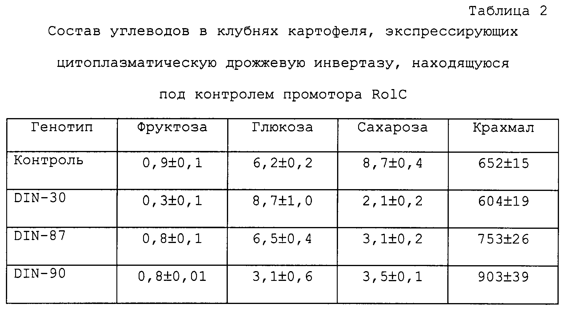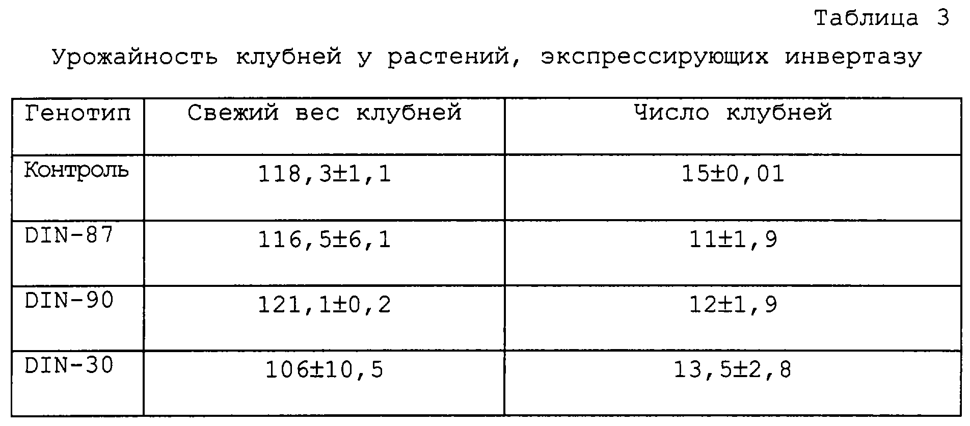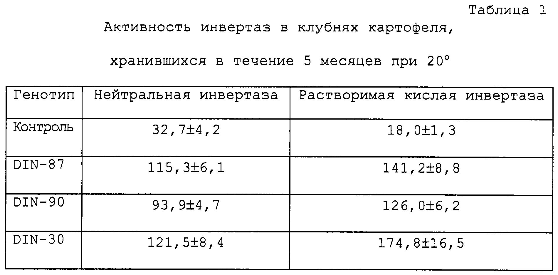 Успешная трансформация была протестирована на активность инвертазы с применением электрофореза в SDS-ПААГ в соответствии с описанным ранее (von Schaewen et al., 1990, Embo J., 9, 3033-3044). В этом случае белковые экстракты были приготовлены из срединных жилок листьев растений, регенерированных из тканевых культур. После разделения белковых экстрактов методом электрофореза в 12,5%-ном SDS-ПААГ гель промывали 100 мМ натрий-ацетатного буфера (рН 5,0) в течение 30 минут. После этого гель инкубировали в 100 мМ натрий-ацетатного буфера, содержащего 100 мМ сахарозы при 37 С в течение 1 часа. После короткой промывки дистиллированной водой активность инвертазы визуализировали путем выявления высвобожденных восстановленных углеводов (глюкозы и фруктозы). Гексозы выявляли путем кипячения геля в 0,1%-ном 2,3,5-трифенилтетразолиумхлориде в 0,5 Н NaOH в течение 2-5 минут. Активность инвертазы становилась видимой благодаря образованию интенсивного красного окрашивания. Основываясь на исходном скрининге, удалось идентифицировать 18 независимых трансгенных растений. После дуплицирования тканевых культур экспрессировавшие инвертазу трансгенные растения картофеля переносили в теплицу для образования клубней.