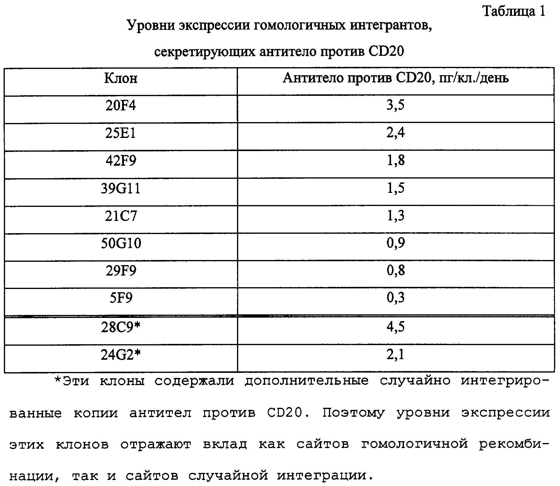 Для всех десяти клонов были оценены уровни экспрессии антитела против CD20, и данные этих оценок представлены в таблице 1.