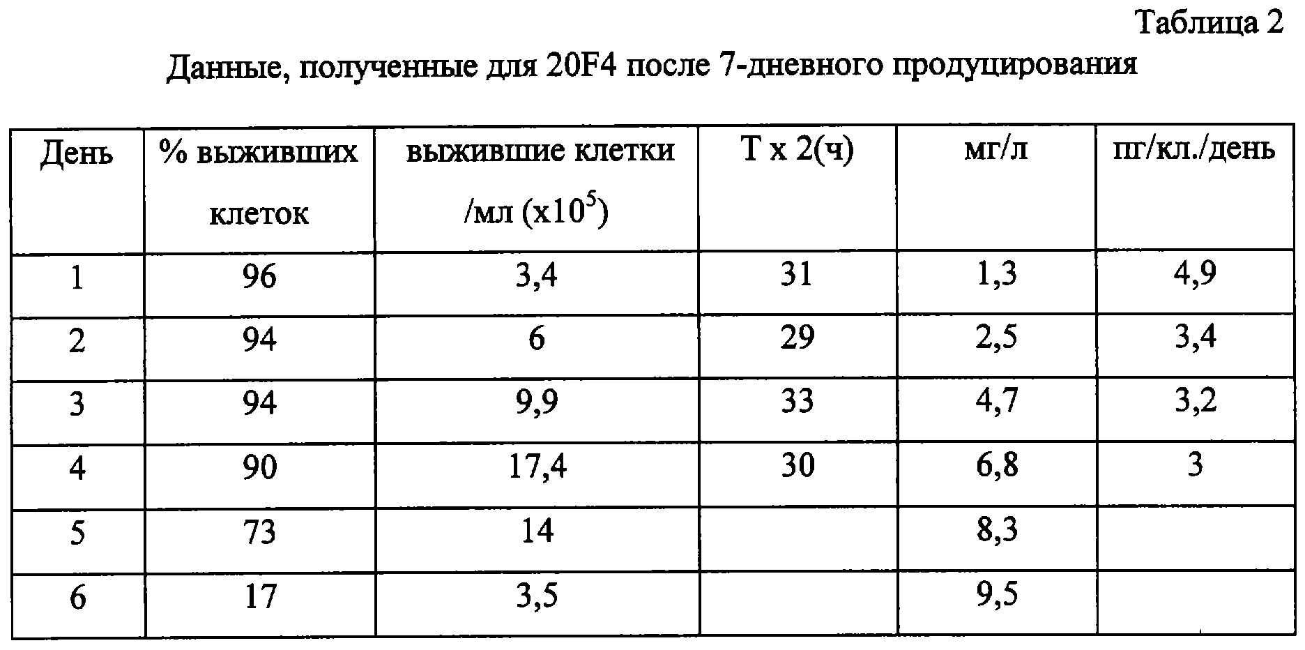 Клон 20F4, продуцирующий наиболее высокий уровень однокопийного интегранта, был отобран для дальнейшего исследования. В таблице 2 представлены результаты ELISA и данные по культивированию клеток, полученные из семидневных стадий продуцирования этого клона.