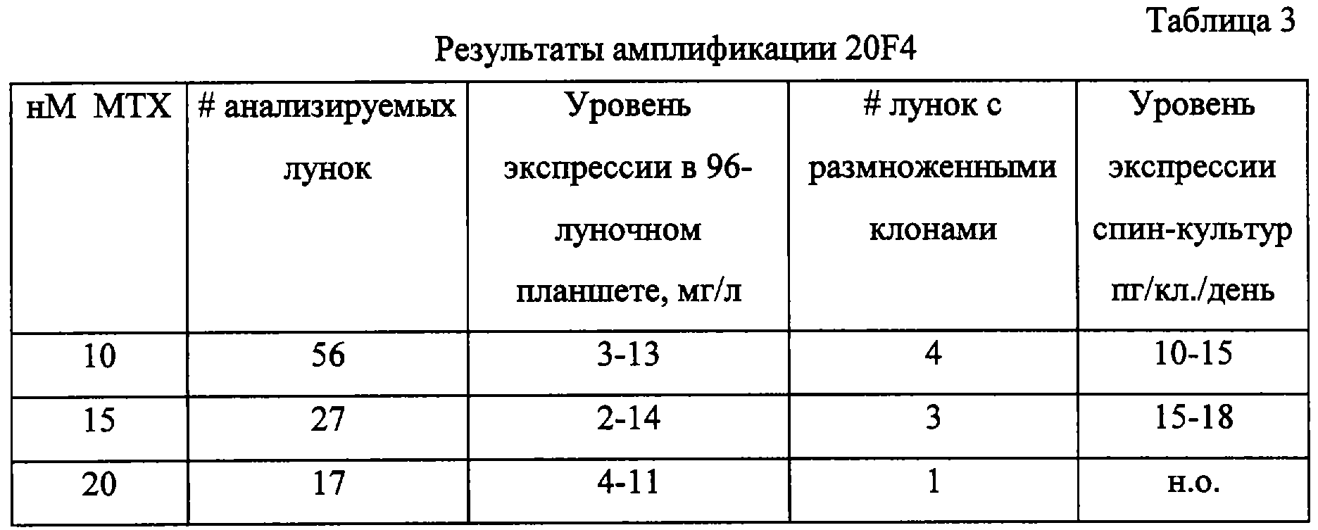 Для дополнительной иллюстрации эффективности этой системы, нами было также продемонстрировано, что этот сайт может быть амплифицирован, что может приводить даже к более высоким уровням экспрессии гена и секреции белка. Амплификацию осуществляли путем посева 20Г4-клеток в серийных разведениях, начиная с плотности 2,5 104 клеток/мл, в 96-луночные планшеты для культивирования тканей, и культивирования этих клеток в средах (CHO-SSFMII), в которые было добавлено 5, 10, 15 или 20 нМ метотрексата. Антителосекретирующие клоны скринировали с использованием стандартной ELISA-техники, и наиболее высокопродуцирующие клоны были размножены, а затем проанализированы. Результаты этого эксперимента по амплификации представлены в таблице 3.