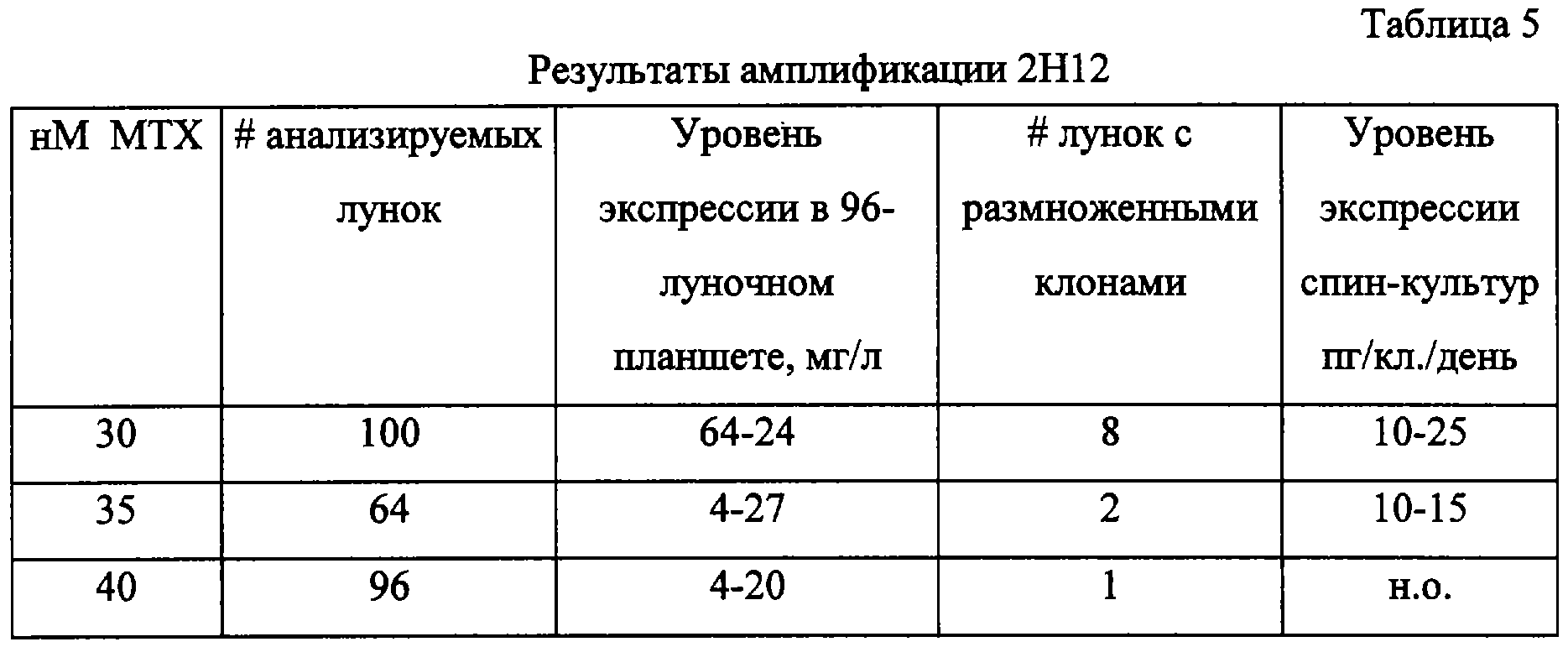 Амплификацию с использованием метотрексата 20F4-15A5 проводили, как описано в тексте, с использованием концентраций метотрексата, указанных в таблице. 4 Клоны в лунках с наиболее высокой степенью продуцирования, номера которых указаны в столбце 4, размножали в роллерных 120 мл-колбах. Уровни экспрессии от клеточных линий, полученных из этих лунок, выражены в пг/клетку в день и приведены в столбце 5.