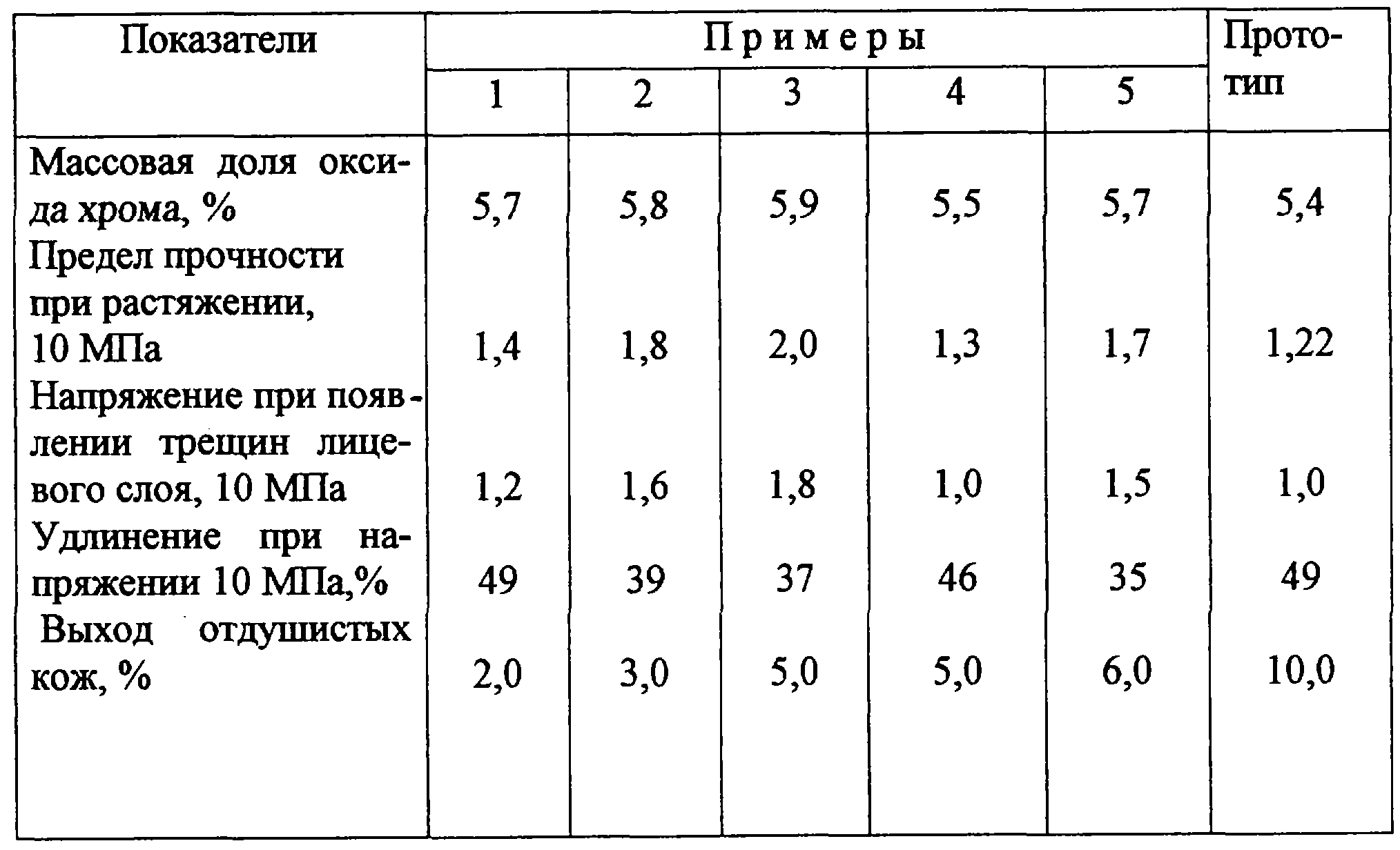 Качественные показатели полученных кож в сравнении с кожами по прототипу представлены в таблице.