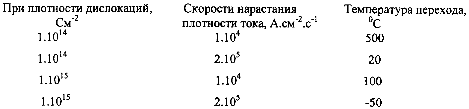 Таким образом, было установлено, что при приближении плотности дислокаций к 1·10 см-2 и предельной скорости нарастания плотности тока, можно обеспечить переход в сверхпроводимость при -50