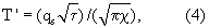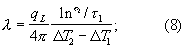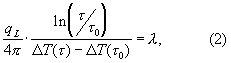 где Т’=Т-Т0, Т – текущая температура датчика, Т0 – начальная температура датчика, qs=(I2R)/(2BL) – плотность теплового потока, I – сила электрического тока, протекающая через датчик, R – электрическое сопротивление датчика, затем строят второй участок термограммы при условиях (3) и (4) и определяют коэффициент теплопроводности