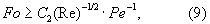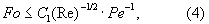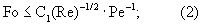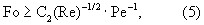 где F0 – число Фурье (для реального плоского источника тепла ограниченной ширины, удовлетворяющего условию ![]() 0, L![]() F0=(![]() ![]() )/(В2/4)), – время, – коэффициент температуропроводности исследуемой жидкости, В – ширина пластины-датчика, L – длина пластины-датчика, – толщина пластины-датчика, C1=120, – число Рейнольдса, число Пекле, и рассчитывают значение коэффициента температуропроводности исследуемой жидкости или газа по зависимости: