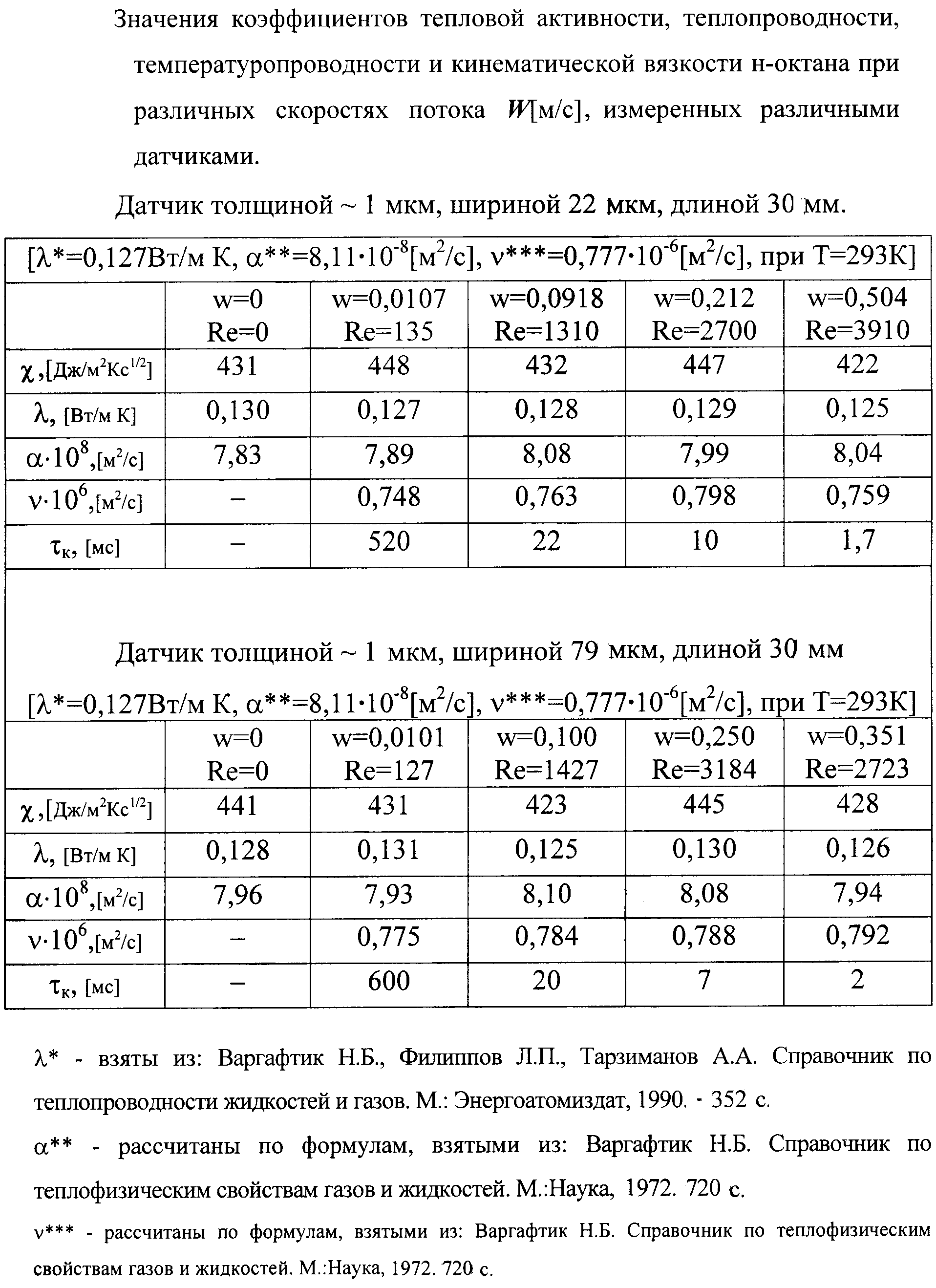 Формула изобретения 1. Способ определения свойств жидкости или газа, включающий построение термограмм для эталонной и исследуемой жидкости или газа, измерение коэффициента теплопроводности и коэффициента температуропроводности, отличающийся тем, что построение термограмм проводят при направленном потоке исследуемой жидкости или газа внутри трубки с нагревательным датчиком со скоростью w, при измерении коэффициента температуропроводности строят начальный участок термограммы, характеризующийся параметрами