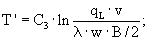 где Т’=Т-Т0, Т – текущая температура датчика, Т0 – начальная температура датчика, qs=(I2R)/(2BL) – плотность теплового потока, I – сила электрического тока, протекающая через датчик, R – электрическое сопротивление датчика, затем строят второй участок термограммы при условиях (3) и (4) и определяют коэффициент теплопроводности по зависимости: