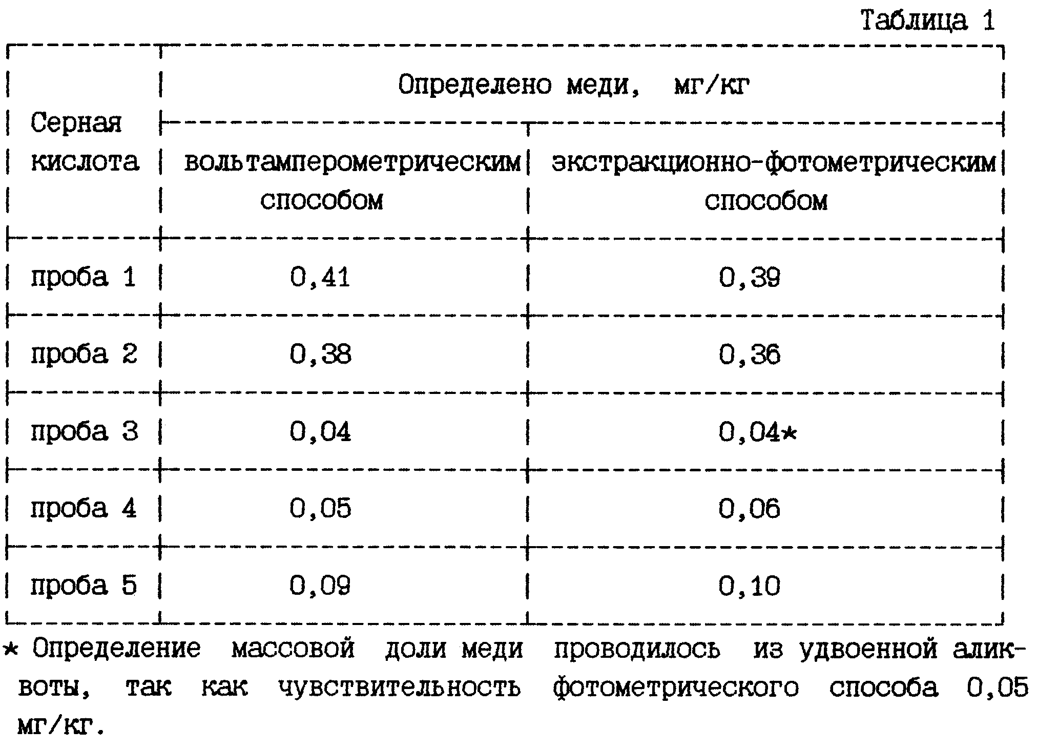 Правильность вольтамперометрического определения меди проверялась путем сравнения с результатами, полученными фотометрическим методом в соответствии с ТУ 113-08-617-87 “Кислота серная марки К” (табл. 1). Определение значимости систематической погрешности по критерию Стьюдента показало, что систематическую погрешность при 95% доверительной вероятности можно считать незначимой.