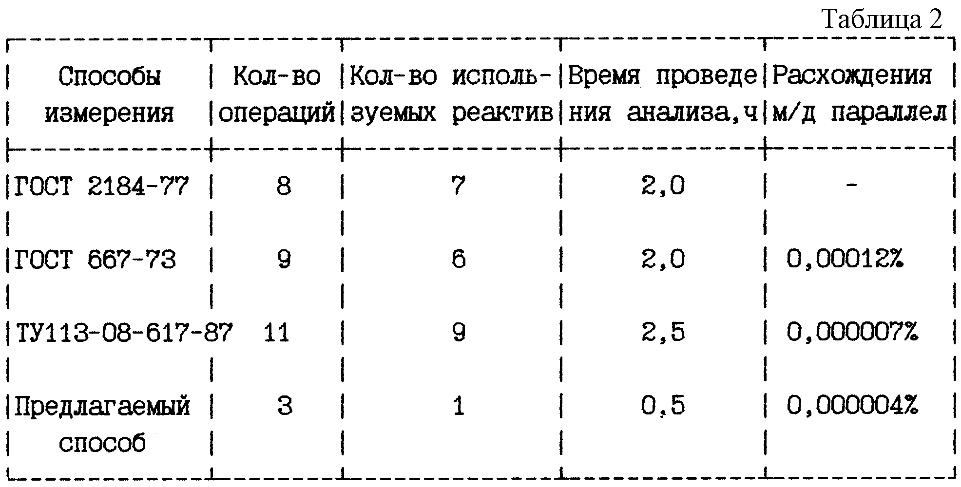На основании данных таблицы 2 можно сделать вывод, что предлагаемый способ по сравнению с аналогами и прототипом является наиболее точным, время проведения анализа сокращается в 4-5 раз, уменьшается количество используемых реактивов.