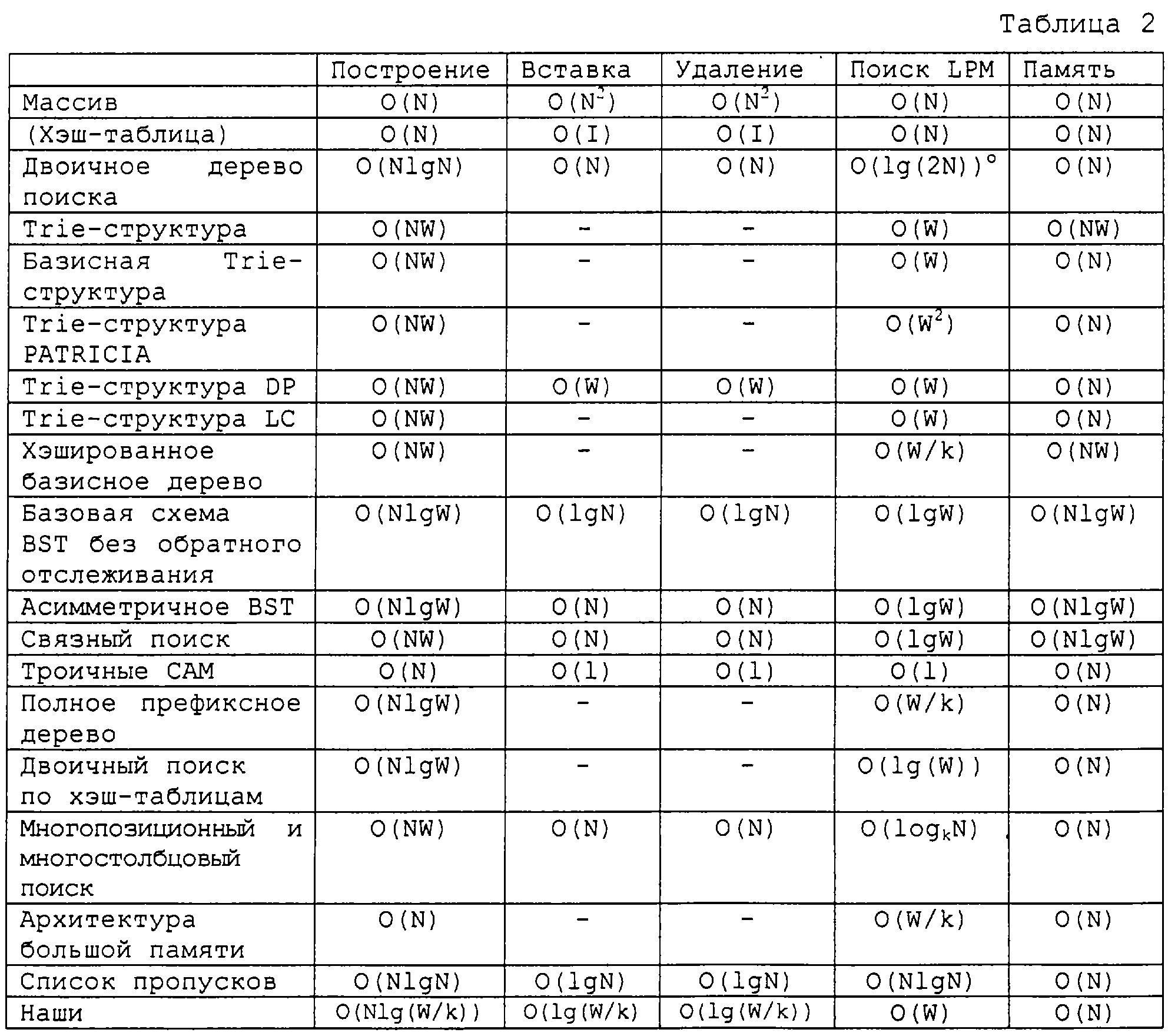 Со ссылками на таблицу 2 ниже приведено сравнение нового алгоритма с известными алгоритмами. В общем случае при оценке того или иного алгоритма для наихудшего случая сравнивается время, необходимое для обработки соответствующего алгоритма, либо требуемый объем памяти, с использованием записи “большое О” (определяющей время выполнения алгоритма). В таблице 2 дана оценка сложности нового алгоритма согласно настоящему изобретению, где имеется N маршрутных записей, для выражения каждого адреса требуется W адресных бит, a k является константой, зависящей от алгоритма.
