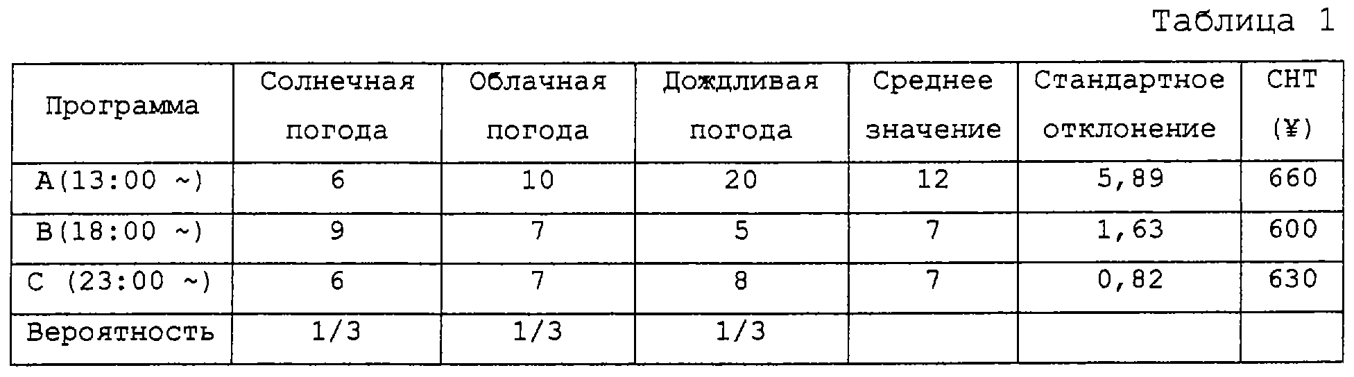 В этом смысле для множества программ, удовлетворяющих упомянутым условиям, из данных наблюдений постороннее значение должно быть исключено (данных рейтинга аудитории для рекламы по телевидению, сохраненных в секции 40 хранения данных о рынке). Может иметь место множество ошибок, существующих или входящих в фактические данные, и по некоторым причинам часть этих ошибок может указывать значение, отклоняющееся от основного значения данных. При анализе статистики, когда данные анализируются путем исследования, то влияние такого постороннего значения предпочтительно следует блокировать с целью минимизации. В этом варианте осуществления данные, существующие в пределах стандартного отклонения, умноженного на определенное целое число от среднего значения, рассматриваются как посторонние значения, и данные наблюдения корректируются так, чтобы данные не включали в себя упомянутое постороннее значение. То есть процесс определяет, следует или не следует исключать постороннее значение, и если определено, что постороннее значение следует исключить, то процесс исключает из данных наблюдений такое постороннее значение, которое было обнаружено при упомянутом условии (то есть при условии, определяющем, что постороннее значение существует в пределах стандартного отклонения, умноженного на определенное целое число от среднего значения). Секция 70 вычисления индекса РР использует выражение (***) для вычисления данных волатильности (стандартное отклонение j, k) с помощью данных, которые применяются с операцией сглаживания данных. Кроме того, секция 70 вычисления индекса РР вычисляет данные о коэффициенте корреляции (коэффициент корреляции jk рекламного продукта j и рекламного продукта k) из данных волатильности. Таким образом, можно вычислить ковариацию jk рекламного продукта j и рекламного продукта k.