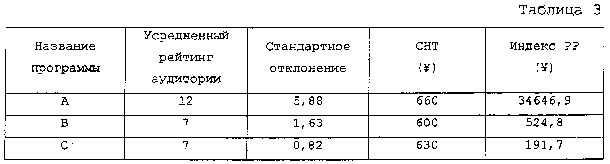 В этом случае для объяснения данных значений преобразования индекса РР (фиг.2) фактические убытки и данные о прибыли (например, число 598652, показанное как соответствующее строке 1998/4/5), представляют собой реальные данные фактических убытков и прибыль, которые могут иметь место при продаже или покупке рекламного продукта, принадлежащего спонсору, включая такие рекламные производные продукты, как фьючерсы, опционы и свопы, и фактические убытки и прибыль можно вычислить, во-первых, путем определения разности между множеством данных опроса, таких как рейтинг аудитории, который использовался в качестве индекса при покупке спонсором рекламного продукта, и данных фактического наблюдения в конце вещания рекламного продукта, и, во-вторых, путем вычисления фактических убытков и прибыли, понесенных спонсором на основании разности между оцененными данными (в момент создания контракта) и фактическими данными (в конечный момент вещания рекламного продукта). Соответственно данные значений преобразования индекса РР представляют собой форму данных, показывающих данные о фактических убытках и прибыли, преобразованные в СНТ.