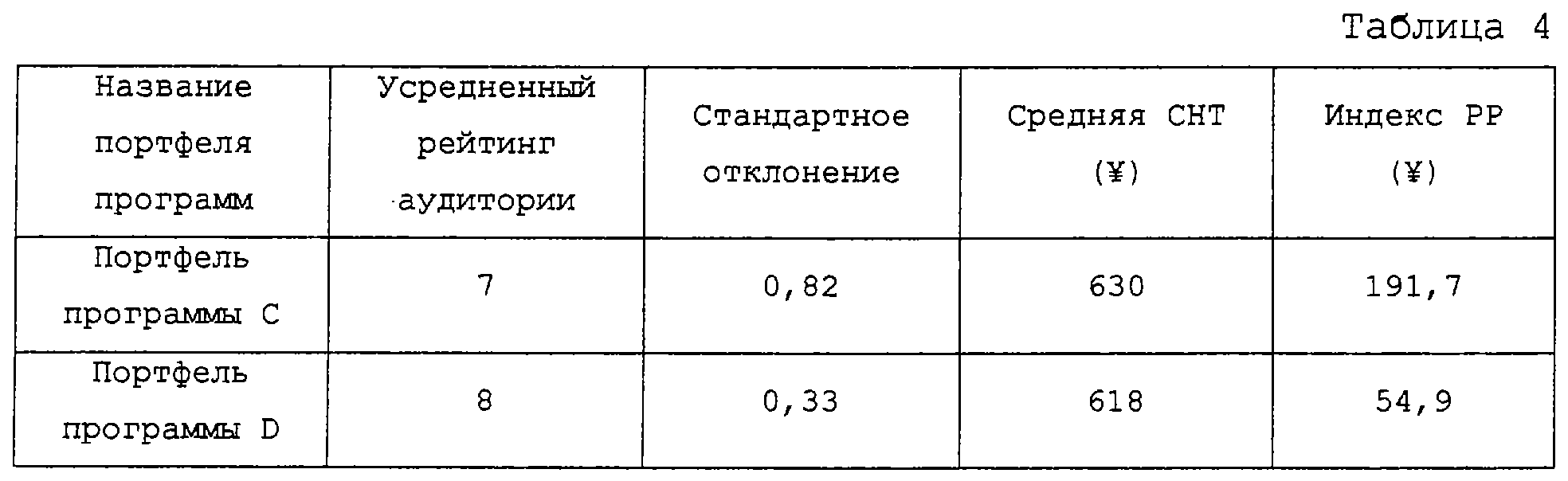 Для вычисления индекса РР для полного “портфеля рекламы” y=(y1,… ,yn) (который подробно описан ниже) согласно настоящему изобретению предположим, что стандартное отклонение в рейтинге аудитории для программы “Sj” обозначено “ j” и совокупная функция распределения со случайной переменной “х” (=рейтинг аудитории), соответствующей нормальному распределению, обозначено N(x), тогда рейтинг аудитории, усредненный по всему портфелю рекламы, вычисляется следующим образом: