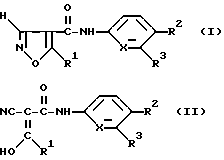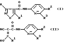 ![]() ![]() в которых R1: а) метил, b) (C3-C6)-циклоалкил, с) (C2-C6)-алкил, имеющий по крайней мере 1 двойную или тройную связь между атомами углерода: R2: а) – CF3 или b) – CN; R3: а) (C1-C4)-алкил или b) атом водорода; Х: а) группа -CH- или b) атом азота, при этом соединение формулы II присутствует как таковое или в форме физиологически переносимой соли. 2. Способ по п.1, отличающийся тем, что вводимое соединение формулы I или II выбирают из соединений, в которых R1: а) метил, b) циклопропил или с) -CH2-CH2-C==CH; R2 – -CF3, R3 – метил или атом водорода и Х – группа -CH-. 3. Способ по п.1, отличающийся тем, что вводимое соединение выбирают из N-(4-трифторметилфенил)-2-циано-3-гидроксикротонамида и N-(4-трифторметилфенил)-5-метилизоксазол-4-карбоксамида. 4. Способ по пп.1 – 3, отличающийся тем, что фармацевтическую композицию вводят в виде твердой дозировочной единицы до 500 мг. РИСУНКИ