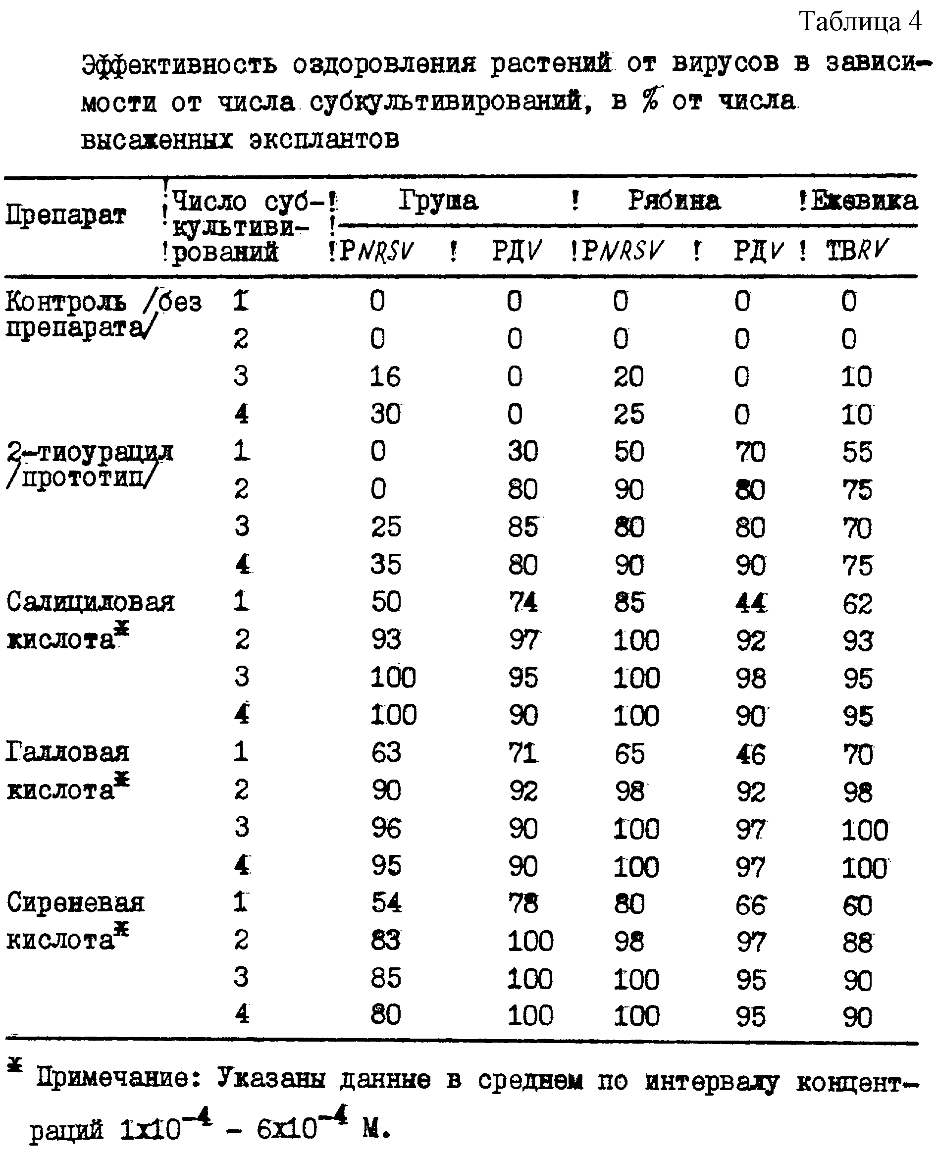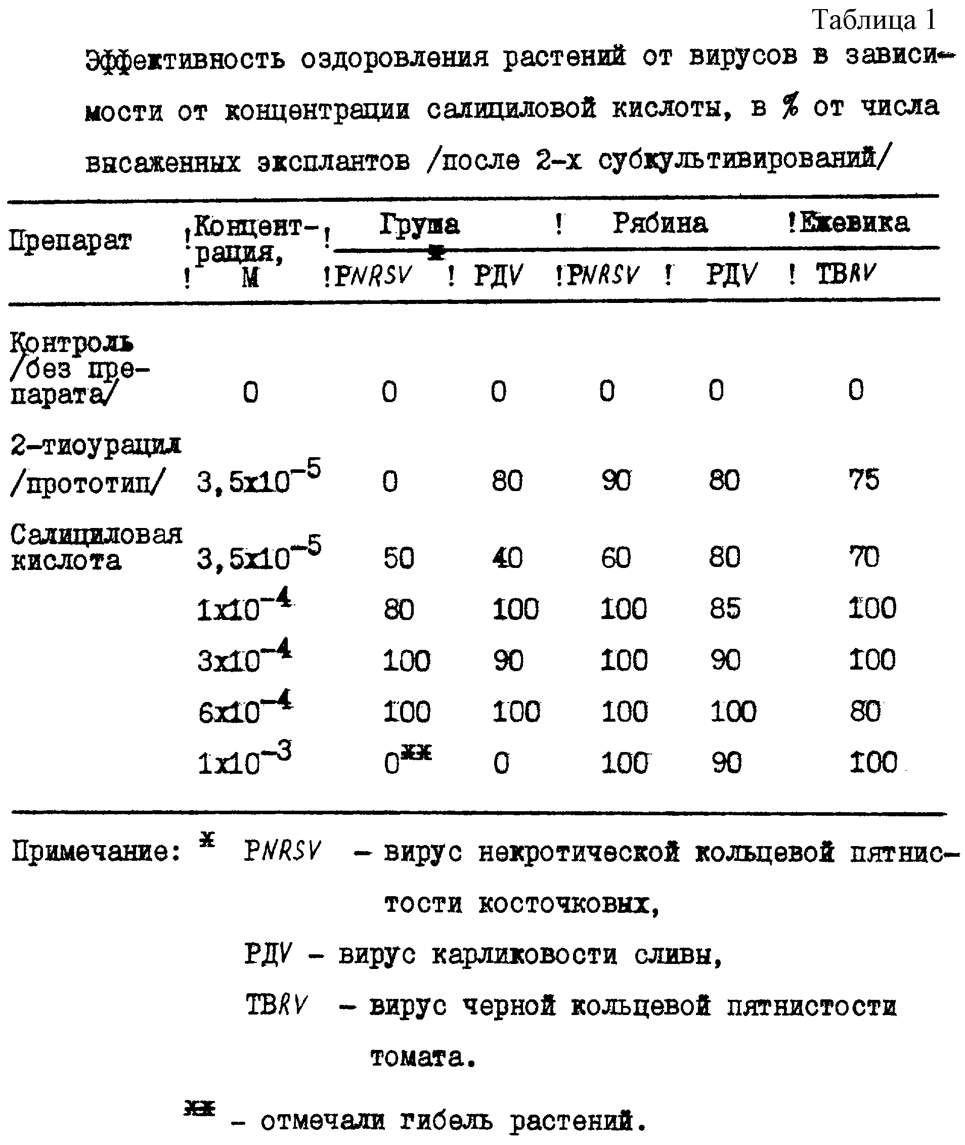 Формула изобретения 1. Способ оздоровления растений от вирусов, включающий высадку эксплантов на питательную среду и их культивирование, отличающийся тем, что в питательную среду дополнительно вводят в качестве фенольного соединения гидроксибензойную кислоту в концентрации 1 10-4-6 10-4 и проводят 2-3 последовательных субкультивирования эксплантов на питательной среде.