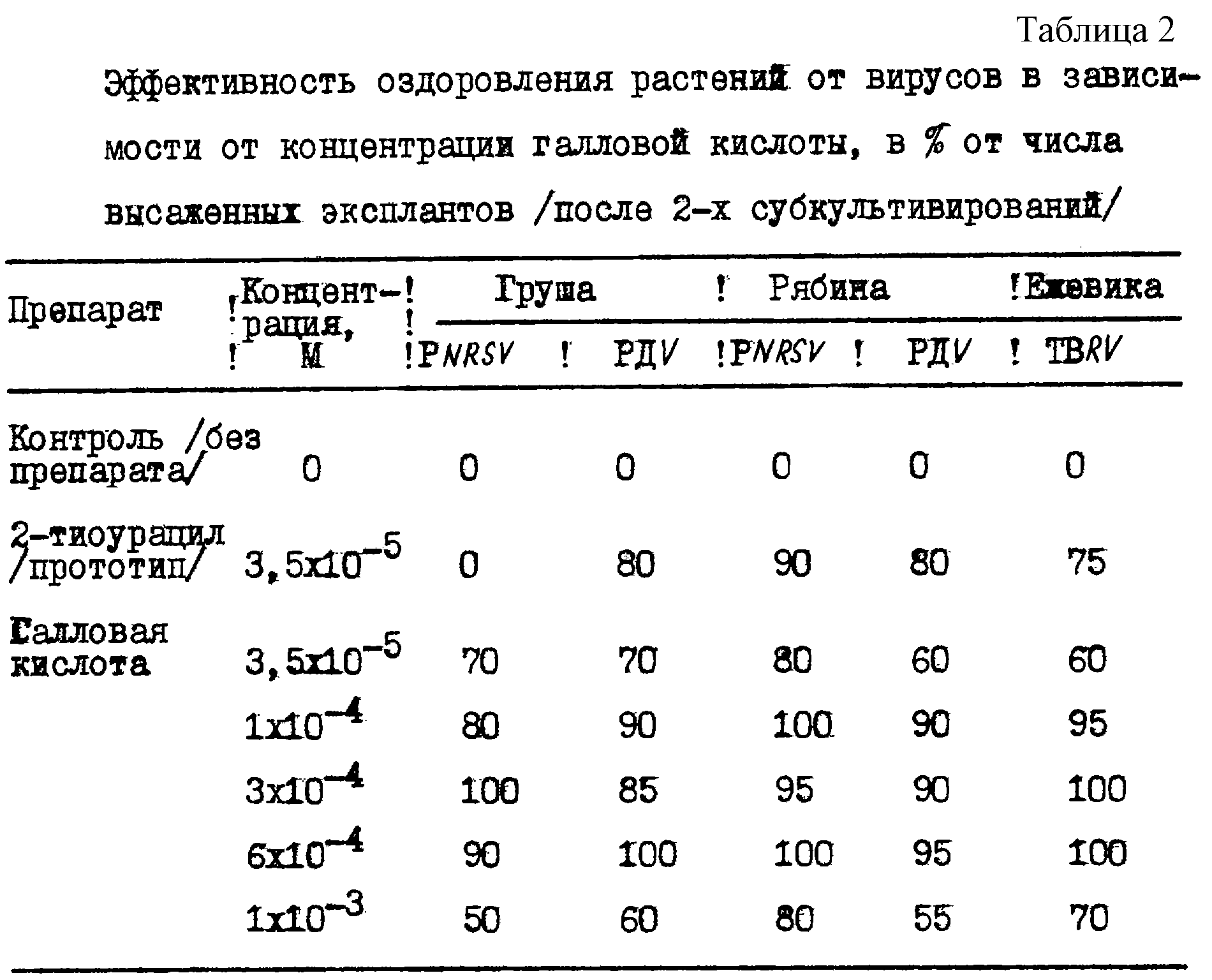 Использование галловой кислоты в концентрации 1 10-4 M приводило к повышению эффективности оздоровления от вирусов у груши – на 10-80%, рябины – на 10%, ежевики – 20% по сравнению с прототипом.