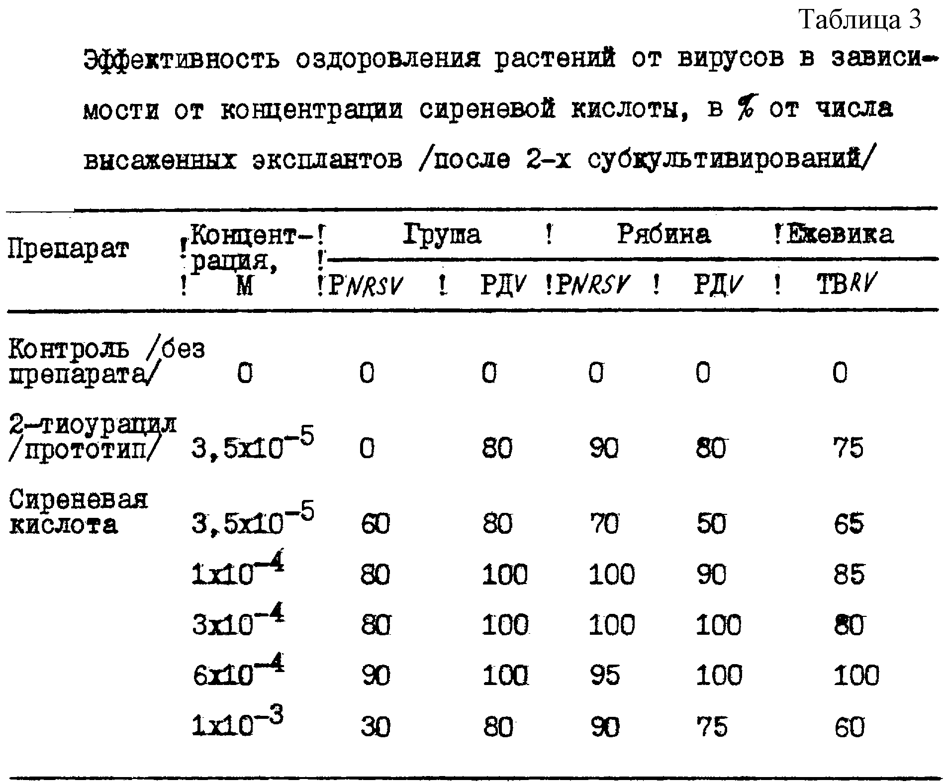 Применение сиреневой кислоты в концентрации 1 10-4 М способствовало повышению эффективности оздоровления от вирусов у груши на 20-80%, рябины и ежевики – на 10% в сравнении с прототипом. Оптимальным интервалом действия сиреневой кислоты были концентрации 1 10-4 – 6 10-4 М.