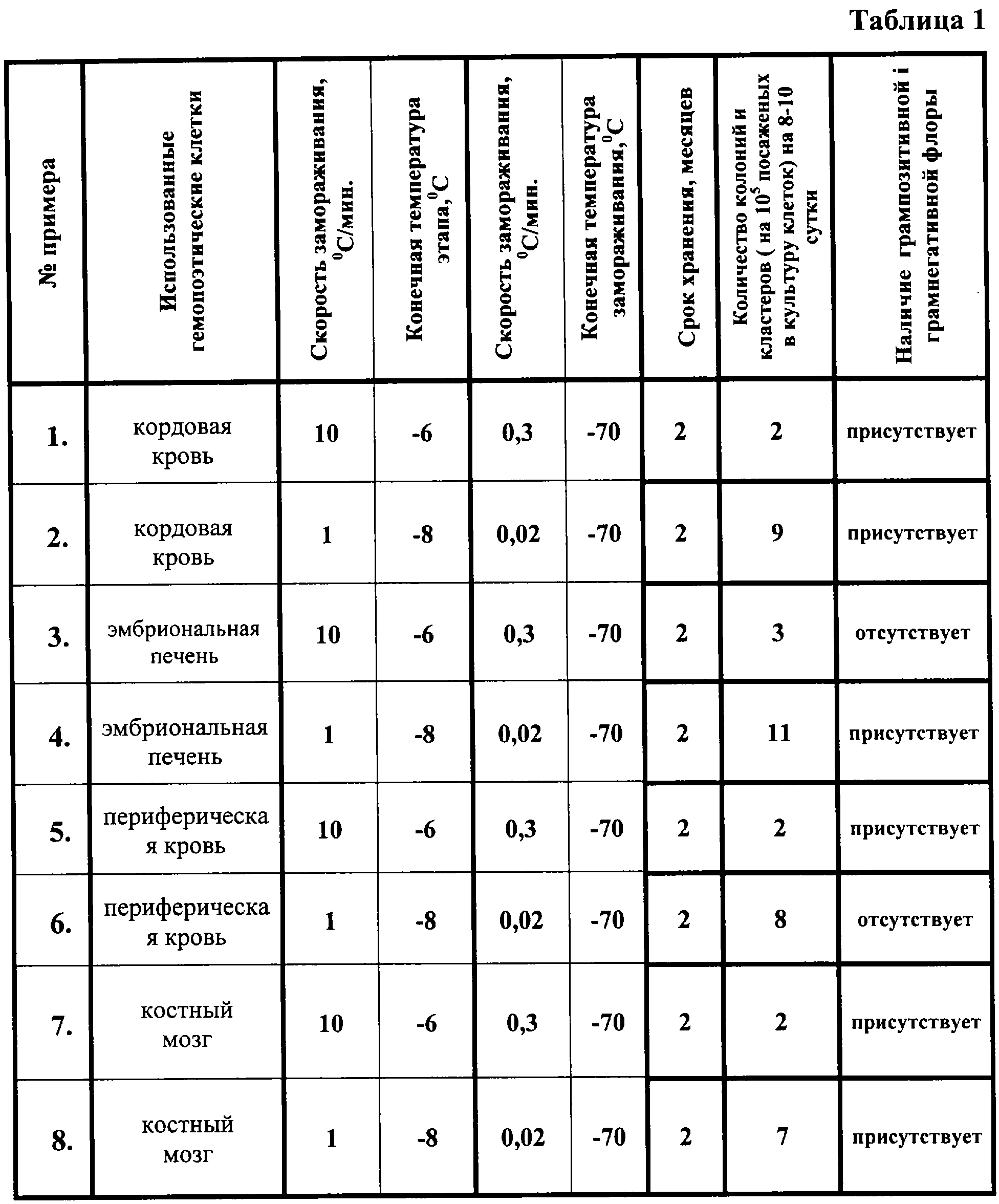 Эффективность режимов, указанных в примерах, оценивали путем проверки жизнеспособности клеток, которые оценивали методом последующего культивирования в агаровой среде клеток, замороженных по режимам, указанным в примерах 1-8, после двухмесячного хранения, а в примерах 9-64 – после трехмесячного хранения при конечной температуре охлаждения, обозначенной в примерах. Эффективность метода также оценивали проведением бактериологического контроля криоконсервированных гемопоэтических клеток.