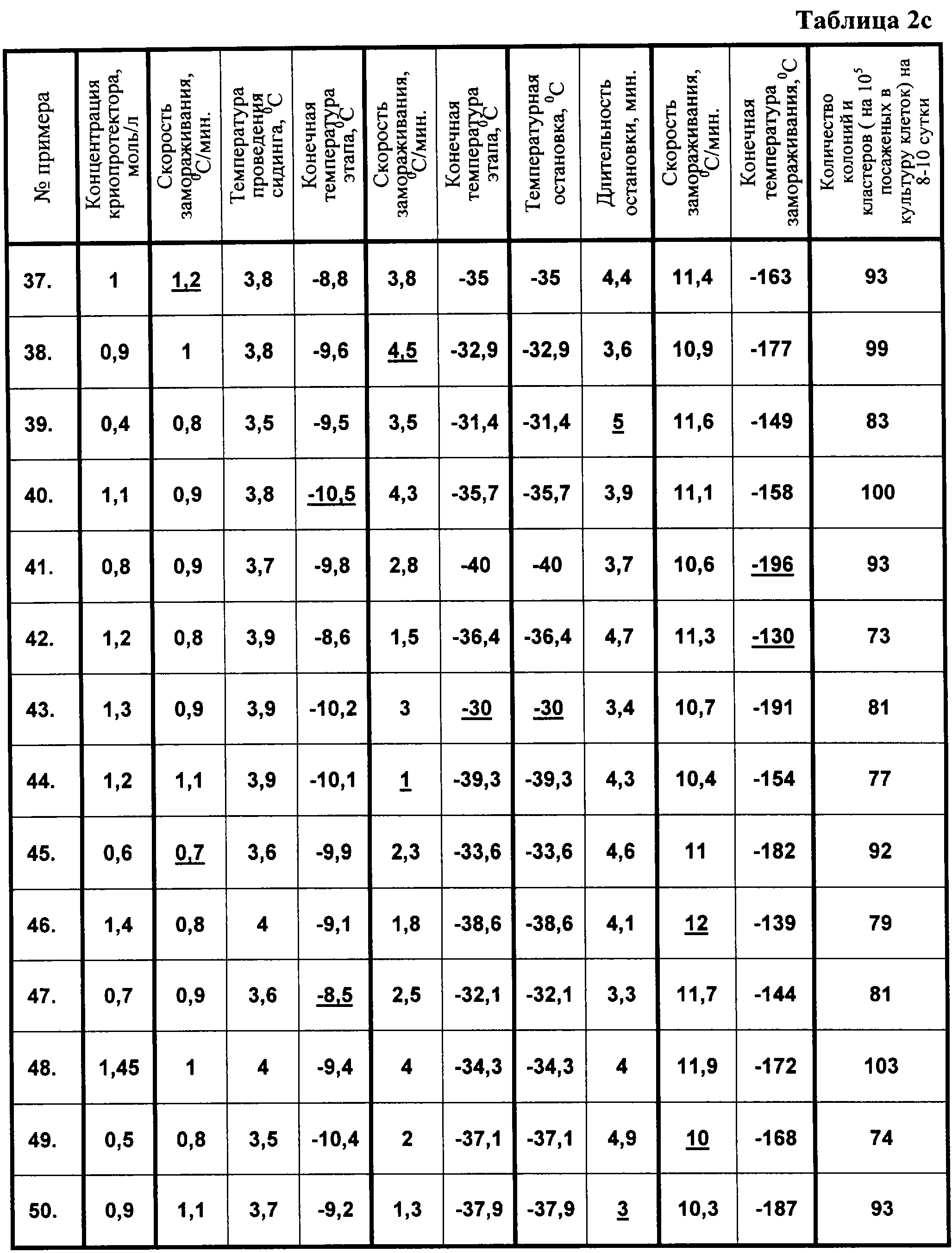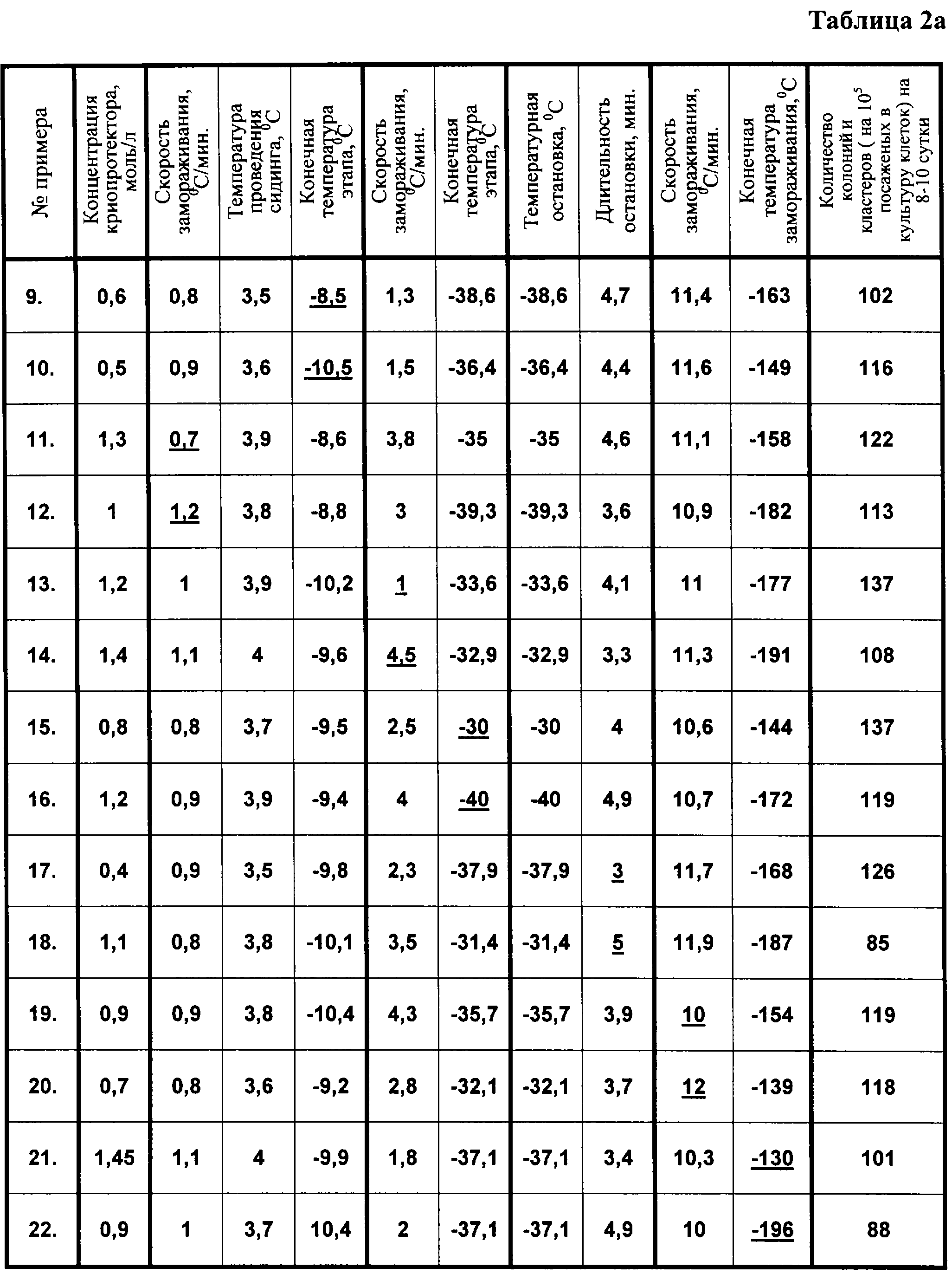 Криоампулы герметично закрывали крышками и маркировали. Замораживание осуществляли при различных режимах, указанных в таблице 1. Замораживание гемопоэтических клеток за прототипом выполняли с помощью программного замораживателя, который позволяет варьировать скорость снижения температуры на различных этапах. Для инициализации кристаллообразования дополнительно вносили в криоампулы зародыши льда во внеклеточное пространство.