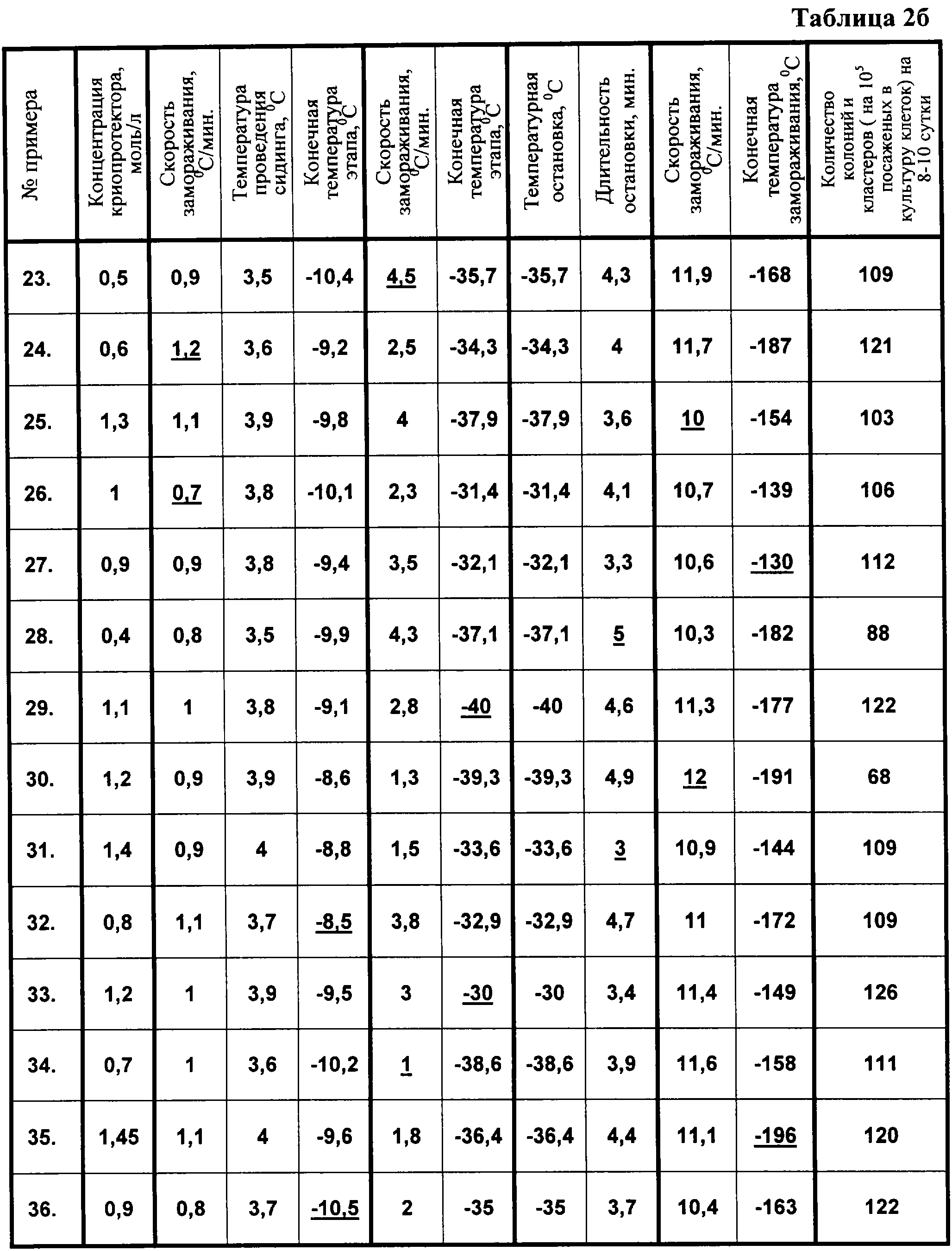 Замораживание клеток выполняли по трехэтапной программе. На первом этапе от комнатной температуры 20±4 С со скоростью 0,7-1,2 С в минуту до минус 8,5-10,5 С. На протяжении первого этапа замораживания при достижении температуры -3,5-4 С осуществляли захолаживание (сидинг) одной стороны контейнера с клеточной суспензией путем разового пропуска через трубку жидкого азота, благодаря чему при соответствующей температуре автоматически происходила инициация кристаллообразования.