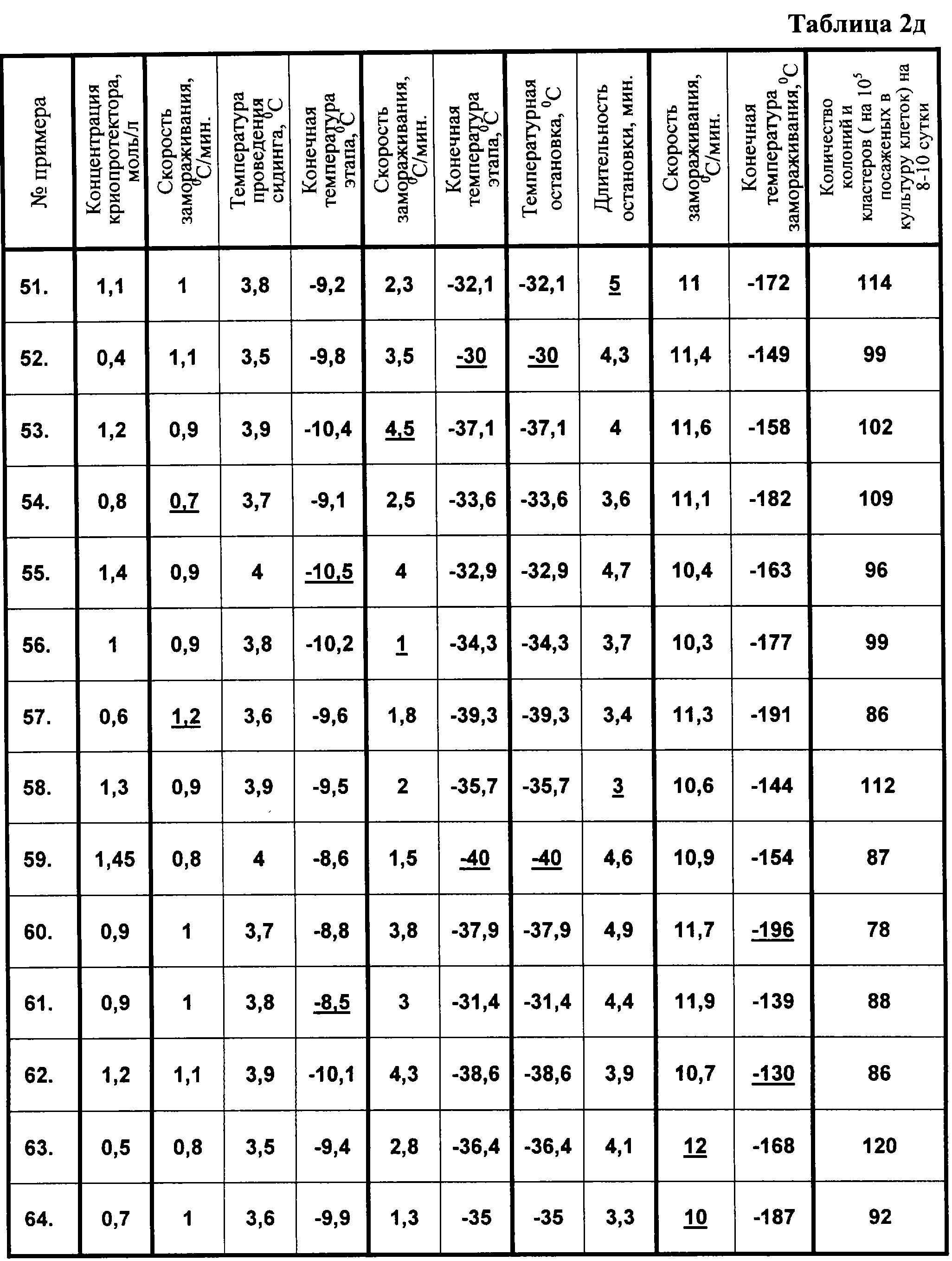 В примерах 9-64 в таблице 2а, 2б, 2с, 2д указано количество колоний и кластеров (на 105 посаженных в культуру клеток) на 8-10 сутки. Примеры 9-64 характеризуются отсутствием грампозитивной и грамнегативной флоры в полученном продукте.