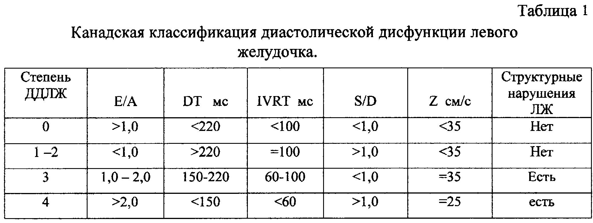 Время изоволюмического расслабления IVRT ЛЖ определяют при одновременной локации из апикального доступа систолического потока в выходном тракте ЛЖ и диастолического трансмитрального кровотока как интервал между окончанием первого и началом второго потоков. Степень ДДЛЖ оценивают в соответствии с канадской классификацией, представленной в таблице 1 [8].