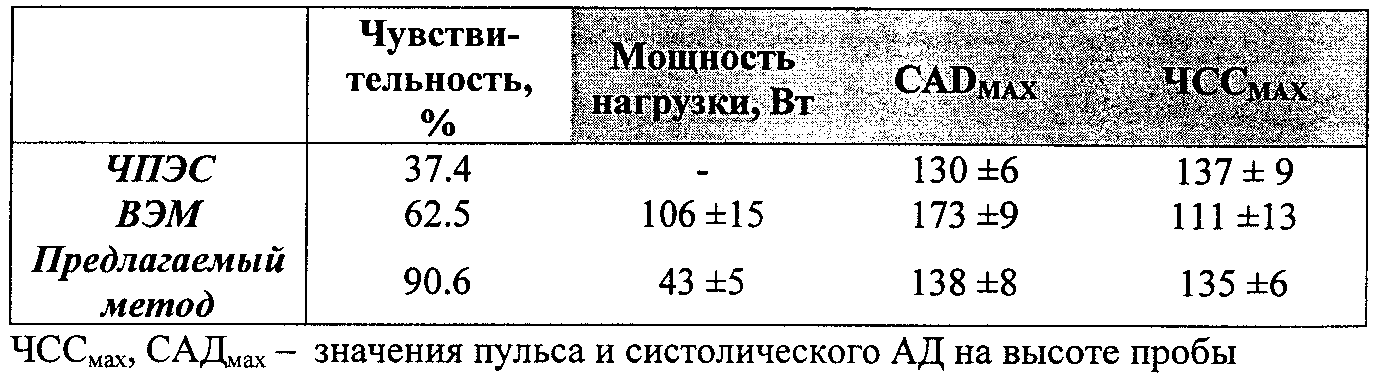 Из таблицы видно, что ЧПЭС сердца как самостоятельный метод диагностики ИБС обладает самой низкой чувствительностью в диагностике ИБС (37.4%). Стандартная велоэргометрическая проба более информативна, ее чувствительность составила 62.5%. Предлагаемый метод проведения нагрузочной пробы оказался самым эффективным, его чувствительность превысила 90%.