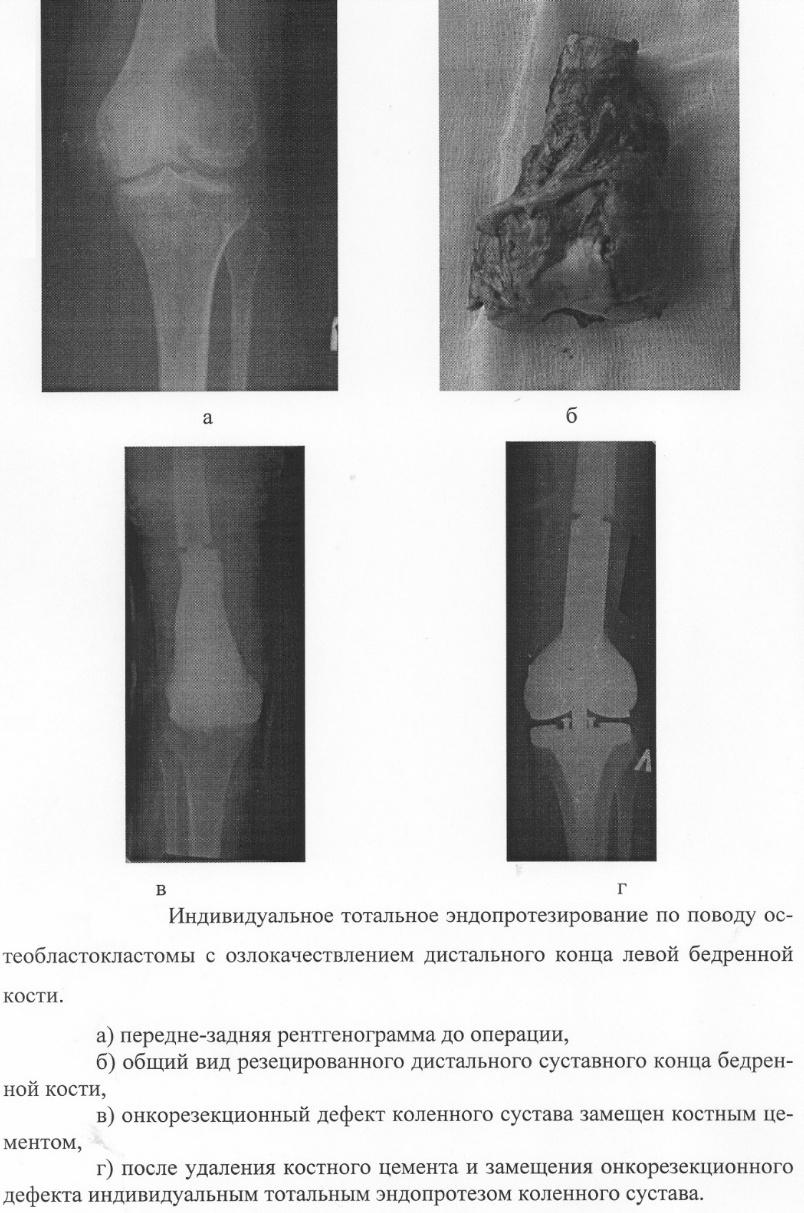 Формула изобретения Способ индивидуального тотального эндопротезирования при злокачественных поражениях суставов, отличающийся тем, что производят удаление опухоли путем сегментарной резекции суставного конца или резекции сустава в целом, образовавшийся онкорезекционный дефект замещают костным цементом с антибиотиками, которому методом ручной лепки из затвердевающей цементной массы придают анатомическую конфигурацию и размеры удаленного суставного конца или сустава в целом, вторым этапом после изготовления и получения индивидуального тотального эндопротеза производят его имплантирование в костно-мышечное ложе, сохраненное костным цементом. РИСУНКИ