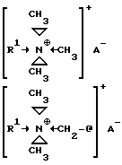 (57) Реферат: Предложена бактерицидная композиция на основе диалкилбензилцетиламмониевых солей, характеризующихся быстрым и стойким биоцидным действием. Смеси соединений содержат амины, которые обладают стойкостью и гермицидной активностью. Композиция характеризуется широкой областью применения в качестве дезинфицирующего средства на всех неадсорбирующих поверхностях: в особенности в санитарии для дезинфекции и стерилизации критических поверхностей в хирургии, в общей медицине и для стерилизации хирургических инструментов, и стоматологических средств, в сельскохозяйственных областях, в качестве фунгицидных и фунгистатических средств при нанесении на любые поверхности и волокнистые материалы, системах кондиционирования воздуха, а также в качестве дезинфицирующего средства. Бактерицидную композицию можно также использовать для стерилизации и замедления роста бацилл в пище, полученной с использованием микроорганизмов, молочных продуктах, пище и напитках, полученных путем ферментации, сельскохозяйственных продуктов, относящихся к агрохимии, съедобных растений, а также для регулирования роста микроорганизмов или ферментативных процессов. 8 с. и 13 з.п. ф-лы, 3 табл. Изобретение относится к антимикробной композиции с низкой токсичностью, содержащей четвертичный аммоний и галогениды. Более конкретно, изобретение относится к новым антимикробным композициям широкого спектра действия с высокой скоростью уничтожения любых бактерий, грибков, спор и вирусов, содержащим полиэтиленамид, оксид аммония и эфир ортофосфорной кислоты. Предлагаемый продукт предпочтительно содержит в качестве анионов галогена хлорид, иодид, тригалид и их смеси. Значительная бактерицидная активность композиции обусловлена присутствием метиламинов благодаря тому, что они обладают очень низкой токсичностью и при этом не вызывают снижения эффективности композиции в соответствии с изобретением. В настоящее время известно большое число антимикробных агентов. Было обнаружено, что четвертичные соли аммония (далее ЧСА) высоко эффективны в качестве биоцидов, в особенности в качестве гермицидов, бактерицидов и фунгицидов, которые в основном применяют в медицинской практике в качестве дезинфицирующих средств. Это соединение легко получить по реакции четвертичного амина с галогеном, описание которой приведено во многих источниках, например в [1, 2]. Эффективность этой антимикробной композиции как биоцида также известна. В особенности хорошо известны такие соединения, как соли н-алкилтриметиламмония и соли алкилбензилдиметиламмония, общие формулы которых приведены ниже: ![]() где @ – фенильная группа, R1 – алкил или алкилен, линейный или разветвленный, n – от 1 до 20, A – анион, выбранный из группы, включающей галоген, сульфат, фосфат или ацетат. Эффективность биоцида зависит от длины цепи алкильной группы или подобной ей, что означает, что эффективность композиции зависит от числа углеродных атомов алкильной группы или аналогичной ей и формы этой группы, т.е. линейна эта алкильная группа или она имеет боковые цепи. Антимикробная активность бромидов четвертичного аммония была широко исследована [3]. Показано, что эффективность максимальна для н-алкильных цепей длиной от 14 до 16 атомов углерода. Однако для соединений хлорида н-алкилтриметиламмония 