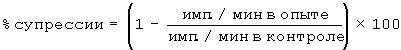 В опытных пробах клетки были прокультивированы в присутствии ЦФ или других исследуемых растворимых добавок. В контроле клетки были культивированы без каких-либо добавок, или в присутствии мышиных тимоцитов, неспособных супрессировать клеточный рост [Seledtsov et al., Immunobiology 1995, 192:205-217]. Уровень пролиферативной клеточной активности определяли стандартным методом по включению в клетки [3H]тимидина, добавленного во все лунки по 0.5 мкСi за 4-5 ч до окончания культивирования. Процент супрессии клеточной пролиферации вычисляли по формуле