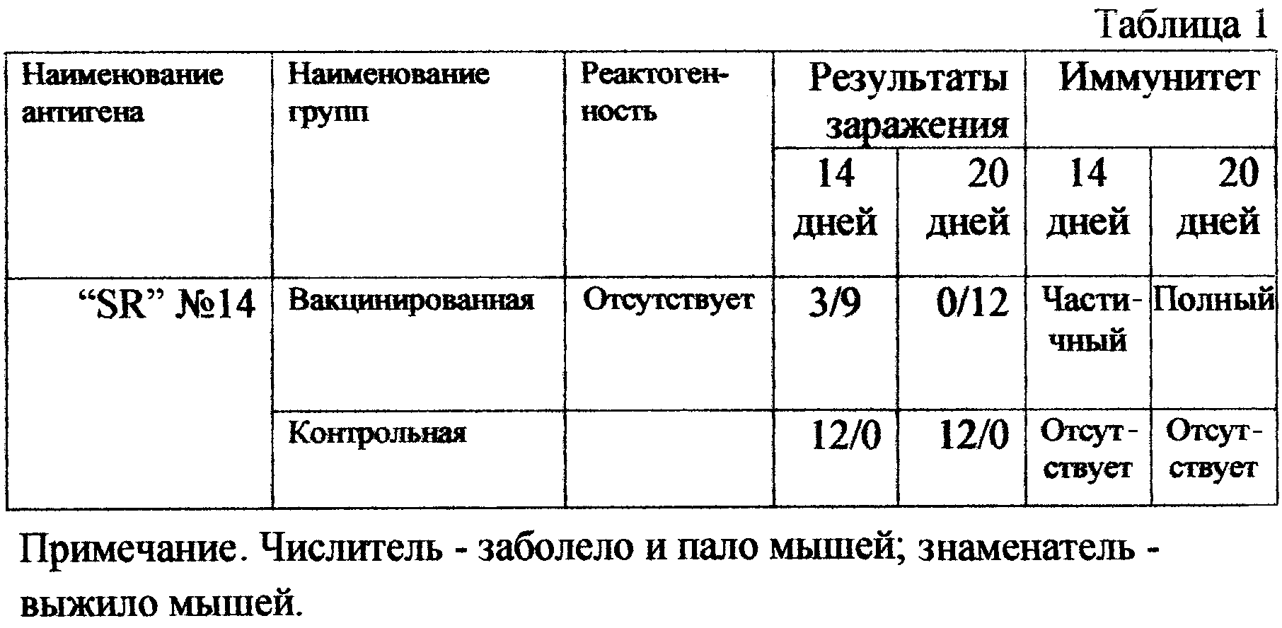 ИММУНОГЕННЫЕ СВОЙСТВА. Пример 1. В опыте были завакцинированы 24 белые мыши инактивированной вакциной, изготовленной из штамма “SR”. Вакцину вводят подкожно в дозе 0,2 мл.