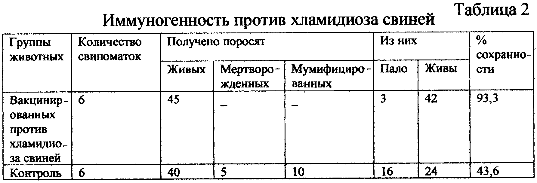 Таким образом, вакцина, изготовленная из штамма Chlamydia psittaci (var. suis) ВГНКИ “SR” №14, обеспечивает у вакцинированных свиноматок сохранность поросят 93,3% против 43,6% у невакцинированных животных.